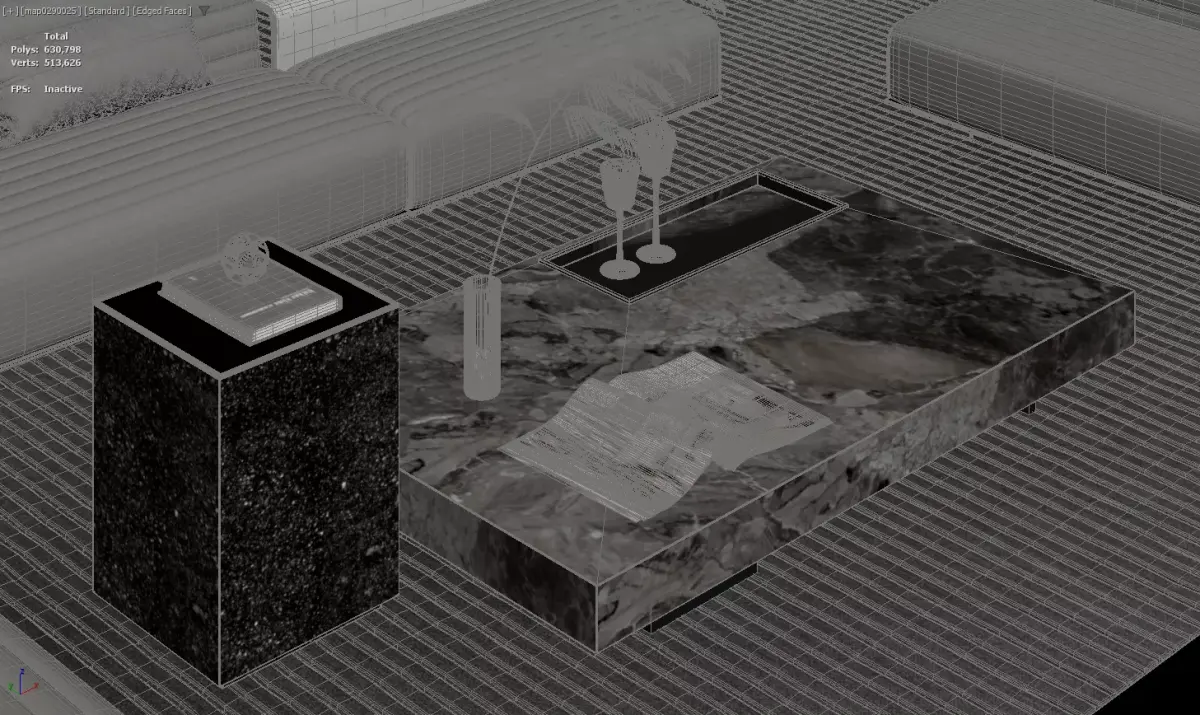 Modern luxury living room featuring a large marble coffee table with intricate veining, modular upholstered sofa in neutral tones, a sleek side table with decorative accents, and curated decor (potted fern, coffee table book, metal ornament). The space is anchored by a textured rug, blending contemporary design with high-end materials for an elegant and inviting atmosphere.