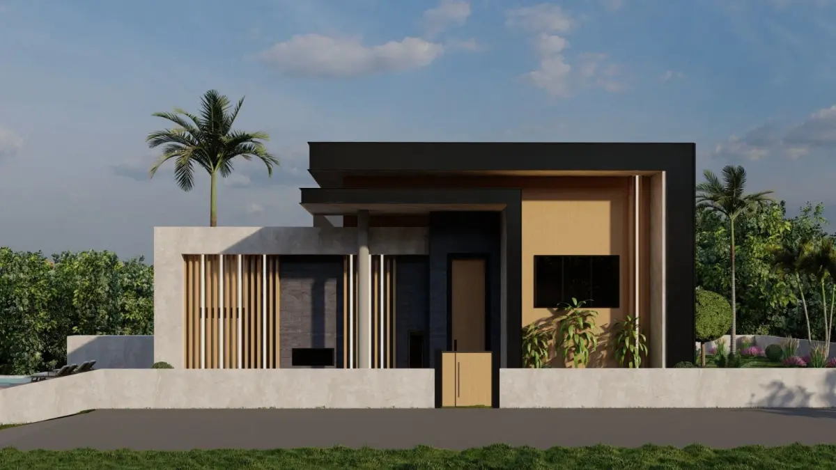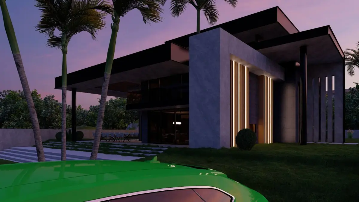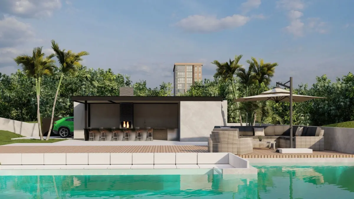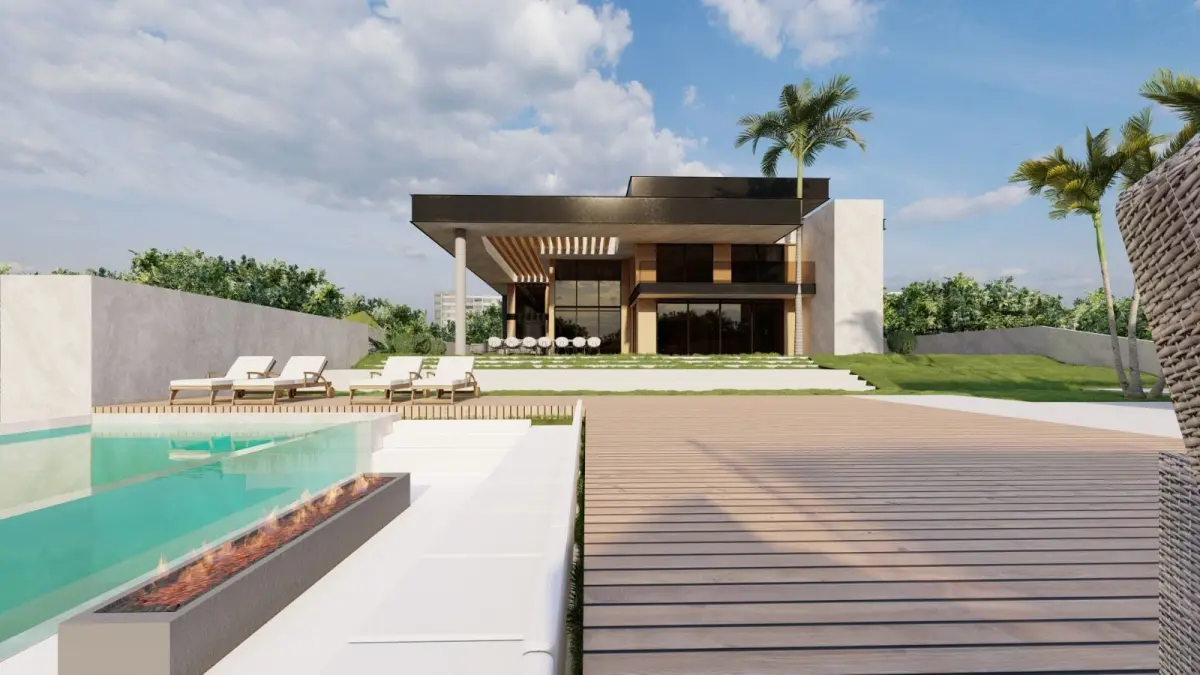 This 3D model showcases a luxury modern villa featuring a stunning poolside setting and contemporary architectural design. With clean lines, expansive glass windows, and sleek geometric forms, this villa design offers a perfect balance of luxury and comfort. The outdoor area includes a spacious deck with lounge seating, and the surrounding landscape is enhanced with tropical elements like palm trees. Ideal for architects, designers, and developers looking to present high-end residential projects, this 3D model is rendered in high quality with Lumion, providing a realistic and visually appealing depiction of a luxurious modern home.
