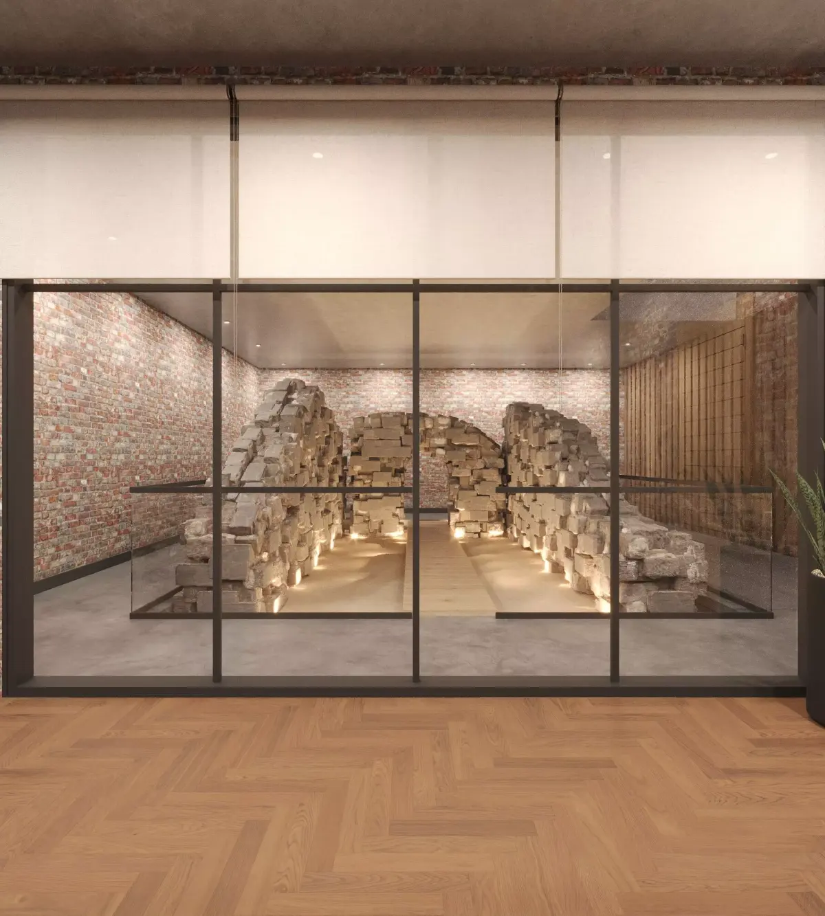 Accent Lighting (3500K): Highlights the artifacts and textured walls, adding a warm, museum-like depth to the space.