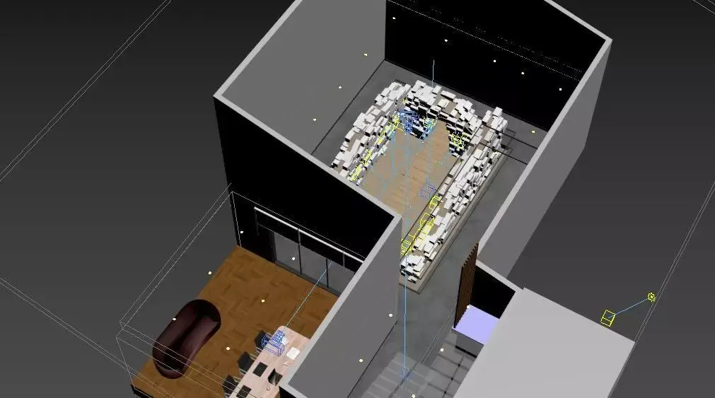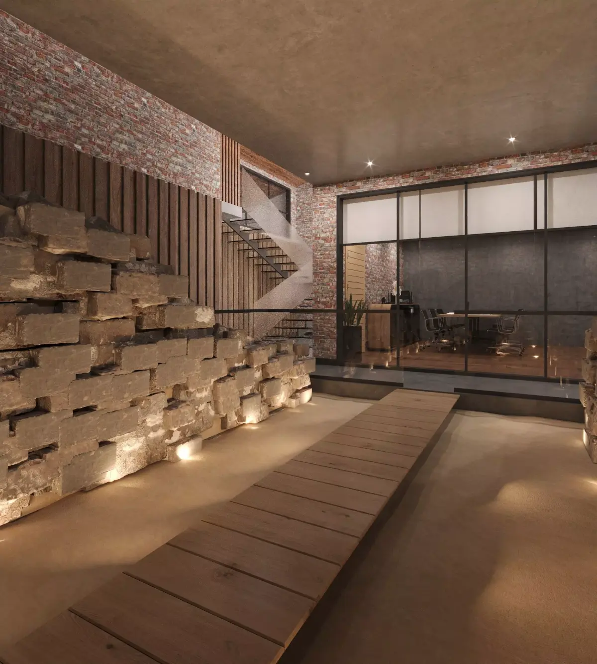 This high-detail 3D model is designed within a basement space, devoid of natural light; however, its successful artificial lighting scenario transforms the atmosphere. The ancient stone artifacts/ruins placed at the heart of the venue create a striking contrast with modern glass partitions and luxurious furniture.