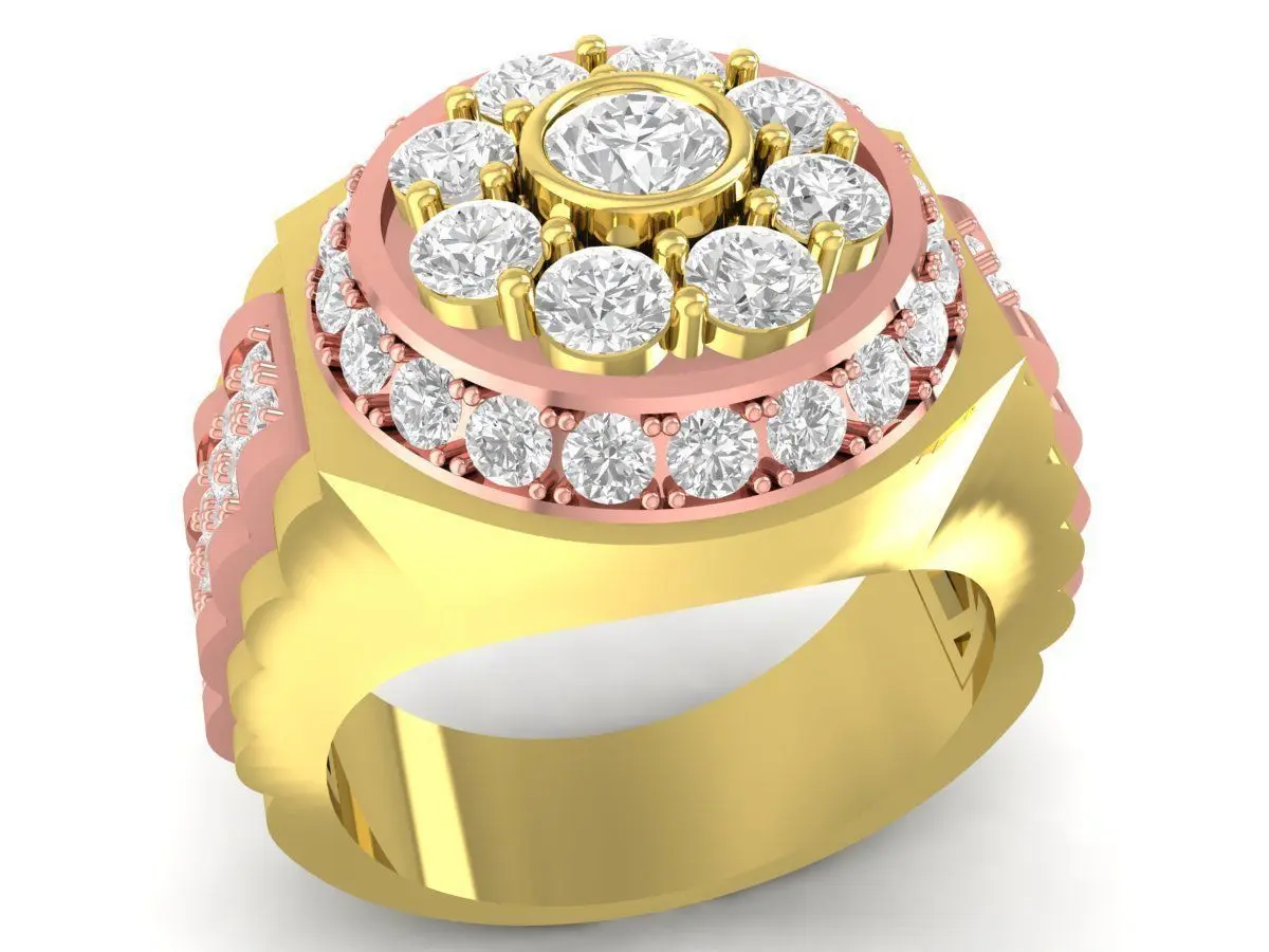 This luxury multi-layer halo diamond men ring features an impressive and elegant structure designed for premium jewelry collections. The centerpiece showcases a large round stone surrounded by multiple halo tiers, each arranged with precision to enhance sparkle and visual depth. The combination of yellow and rose gold elements adds richness to the composition, while the wide band is decorated with pavé side stones to create a balanced and luxurious appearance.