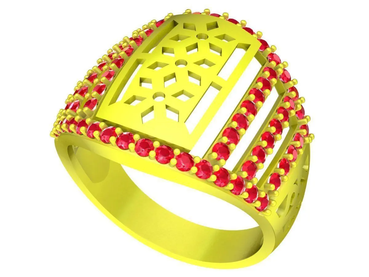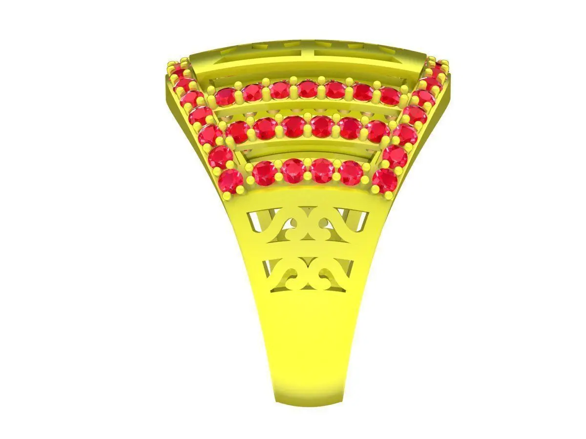 This luxury signet ring features a bold rectangular top design combined with multiple parallel rows of round red gemstone settings along the surface. The structured layout creates a strong visual impact while maintaining symmetry and balance suitable for a masculine style.