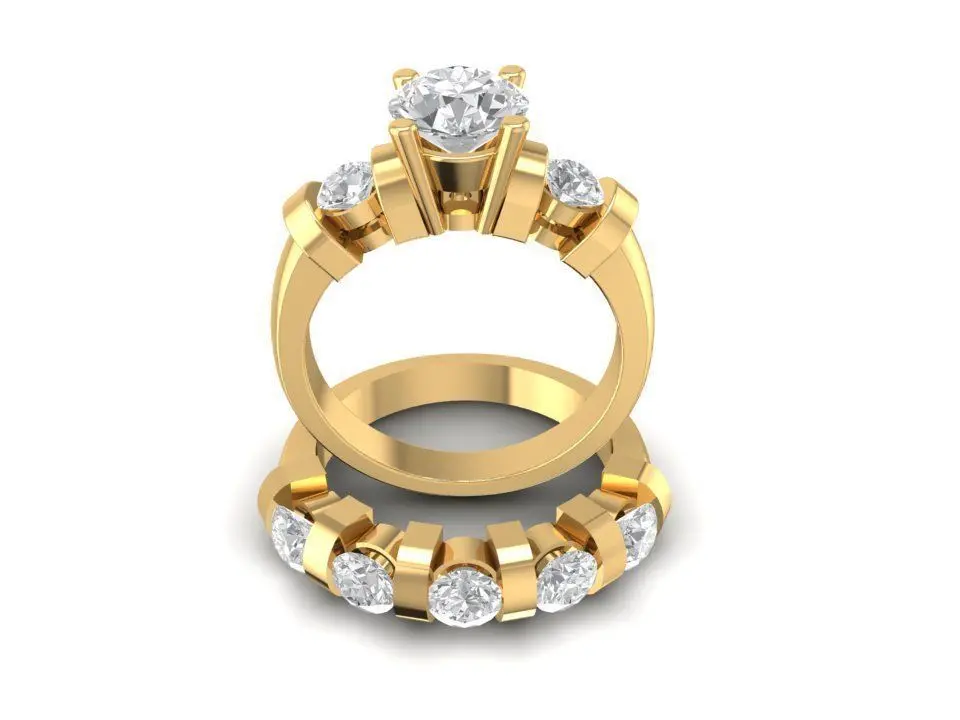 This 3D CAD model showcases a luxurious multi-stone engagement ring designed for women, featuring a large center diamond surrounded by a full circle of perfectly aligned accent stones. The elevated prong setting enhances light reflection, maximizing brilliance and creating a dramatic, high-end appearance. The halo-like arrangement of side stones adds extra sparkle, making the ring suitable for premium fine jewelry collections.