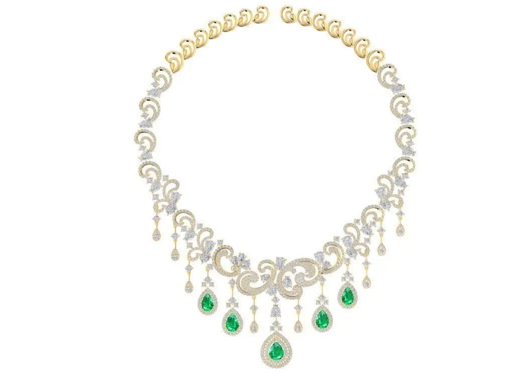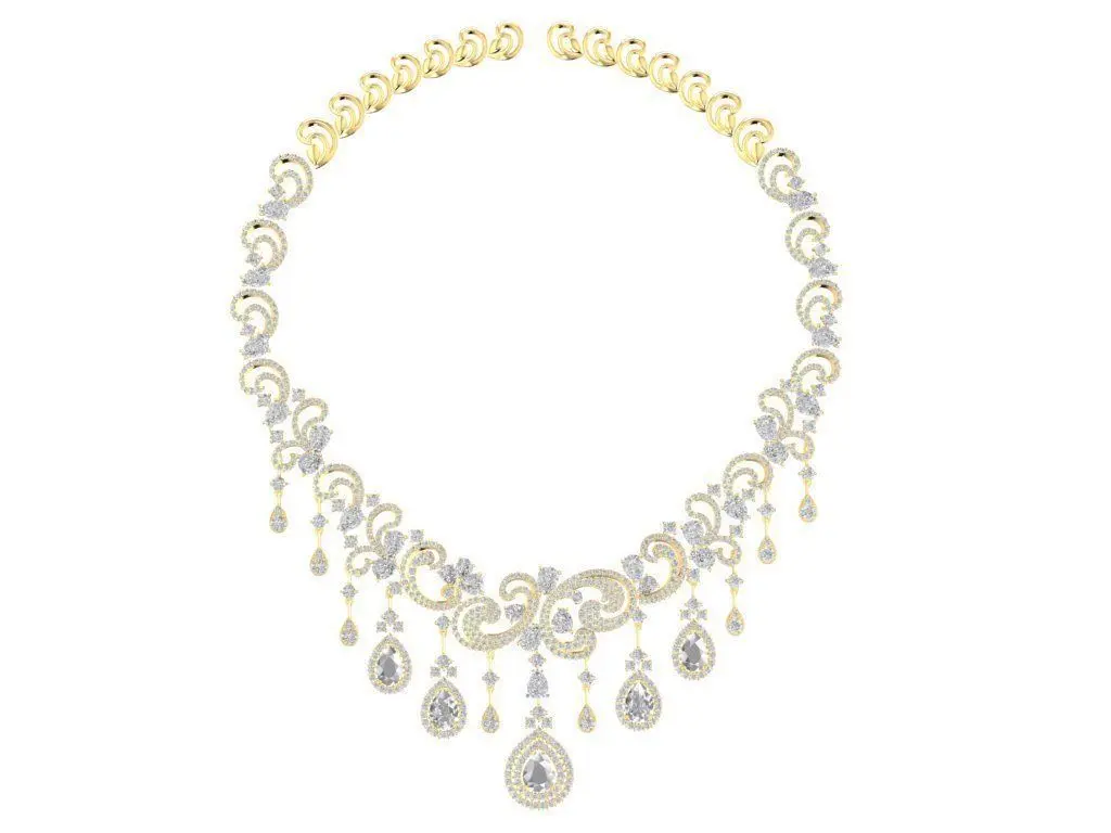 This necklace model is ideal for fine jewelry brands, bridal collections, ceremonial pieces, or designers seeking an ornate statement accessory. The combination of scrolling elements and dangling gemstones gives the piece movement, brilliance, and a premium handcrafted appearance. Perfect for customization or integration into a luxury product line.