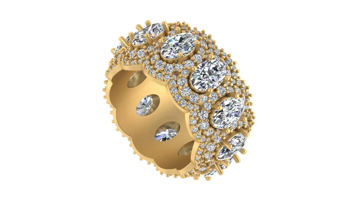 The ring features oval-cut gemstones set in a continuous loop, symbolizing eternity and everlasting beauty.The wide band and diamond-encrusted setting add to the luxury appeal.Intricate Pave Setting: