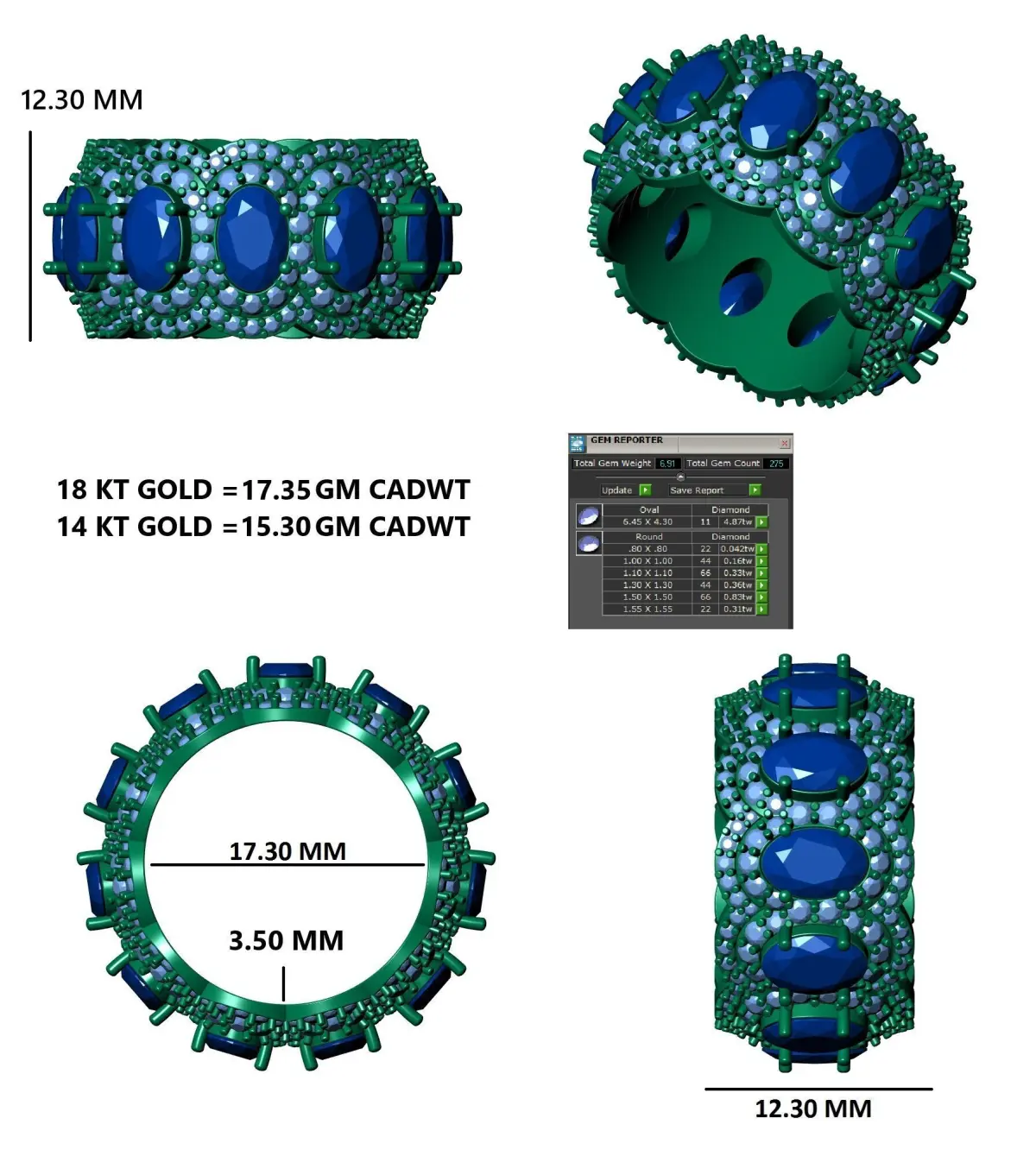 - Gemstone & Diamond DetailsTotal Gem Weight: 5.91 caratsTotal Gem Count: 275 stonesGemstone Breakdown:Oval-Cut Center Stones:6.45 x 3.10 mm – 11 stones (Total Weight: 4.37ct)Round Diamonds:0.80 x 1.00 mm – 22 stones (0.07ct total weight)1.00 x 1.00 mm – 64 stones (0.18ct total weight)1.10 x 1.10 mm – 46 stones (0.26ct total weight)1.50 x 1.50 mm – 66 stones (0.36ct total weight)1.55 x 1.55 mm – 66 stones (0.31ct total weight)The combination of large oval gemstones and smaller pave-set diamonds creates a stunning contrast that enhances brilliance.Design & StyleBold Eternity Band Style: