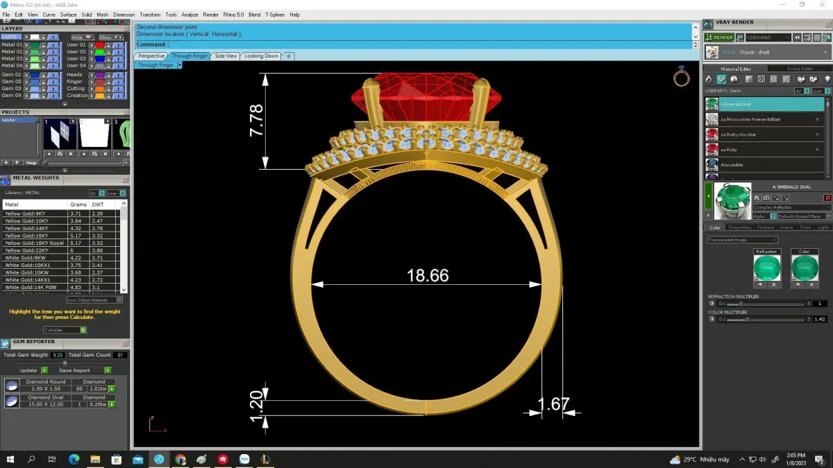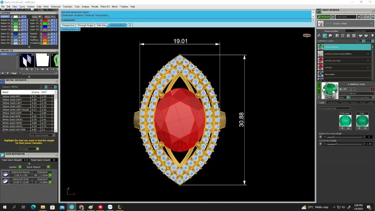 Detailed rendered images are included, clearly showing full dimensions, stone sizes, band thickness, estimated metal weight, and overall proportions. These references allow jewelers and manufacturers to accurately evaluate the design before production or customization.