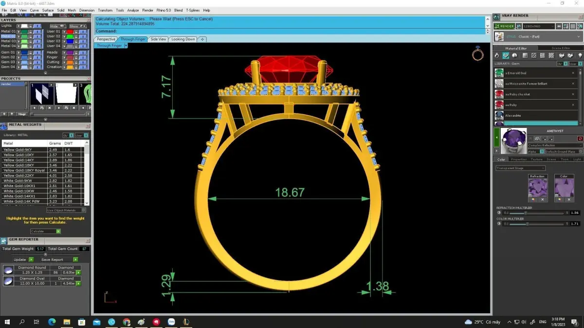Detailed rendered images are included, clearly displaying full dimensions, stone sizes, estimated metal weight, band thickness, and overall proportions. These visual references allow jewelers, manufacturers, and designers to accurately evaluate the design before production.