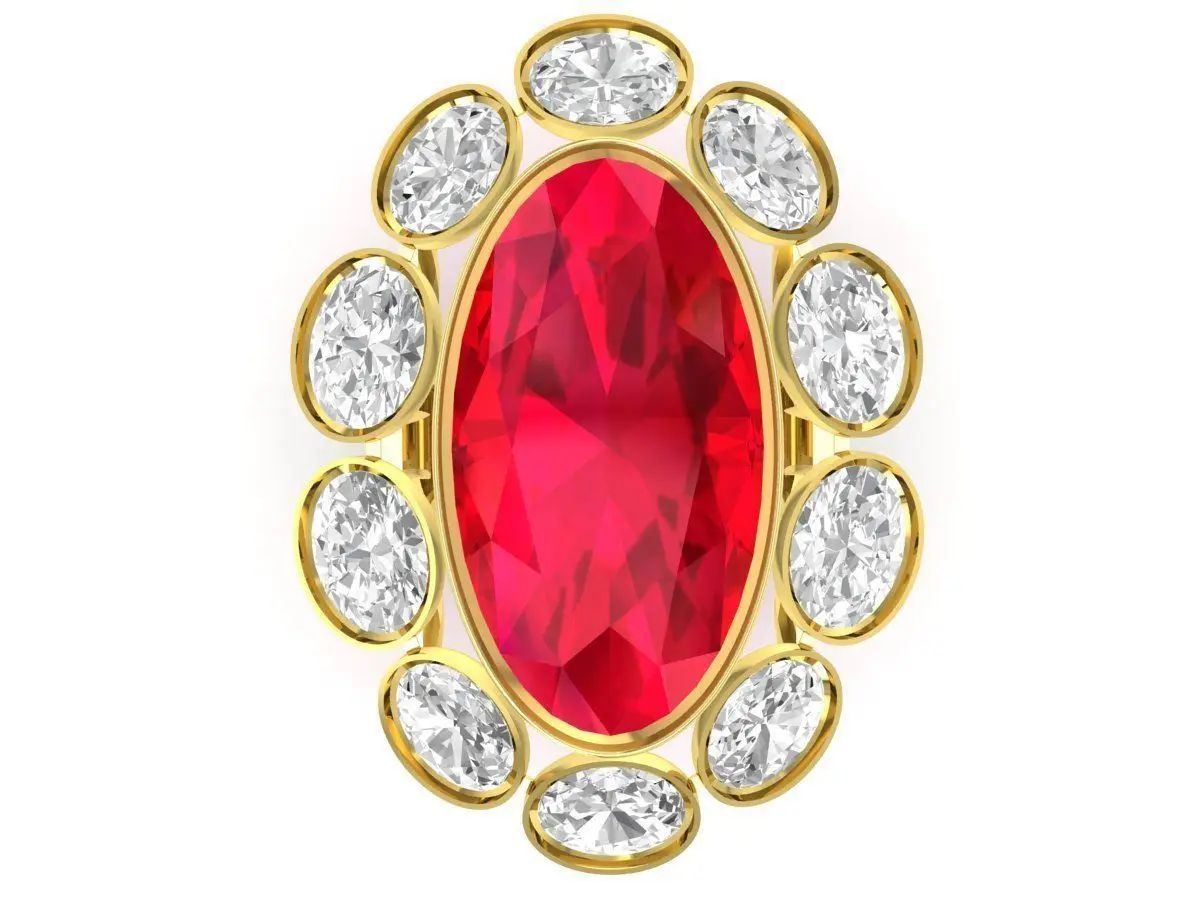 This is a professional 3D jewelry model of a luxury ring featuring an oval-shaped red center stone surrounded by a refined halo of round diamonds. The elongated center stone creates a bold and elegant focal point, while the diamond halo enhances brilliance and visual depth.