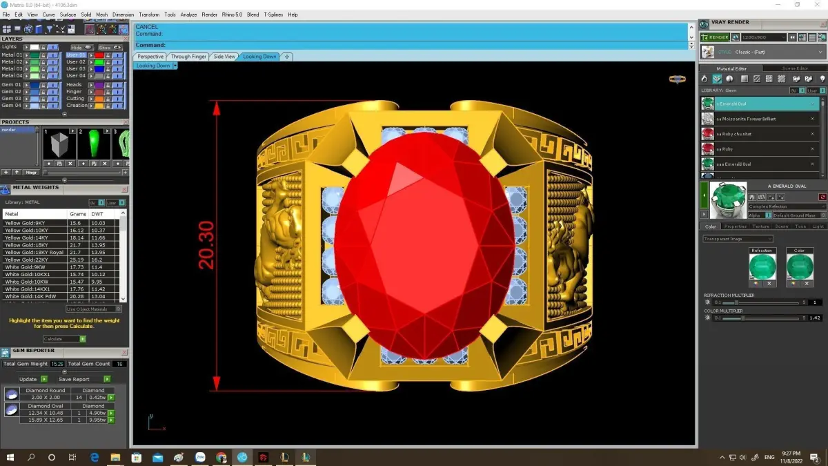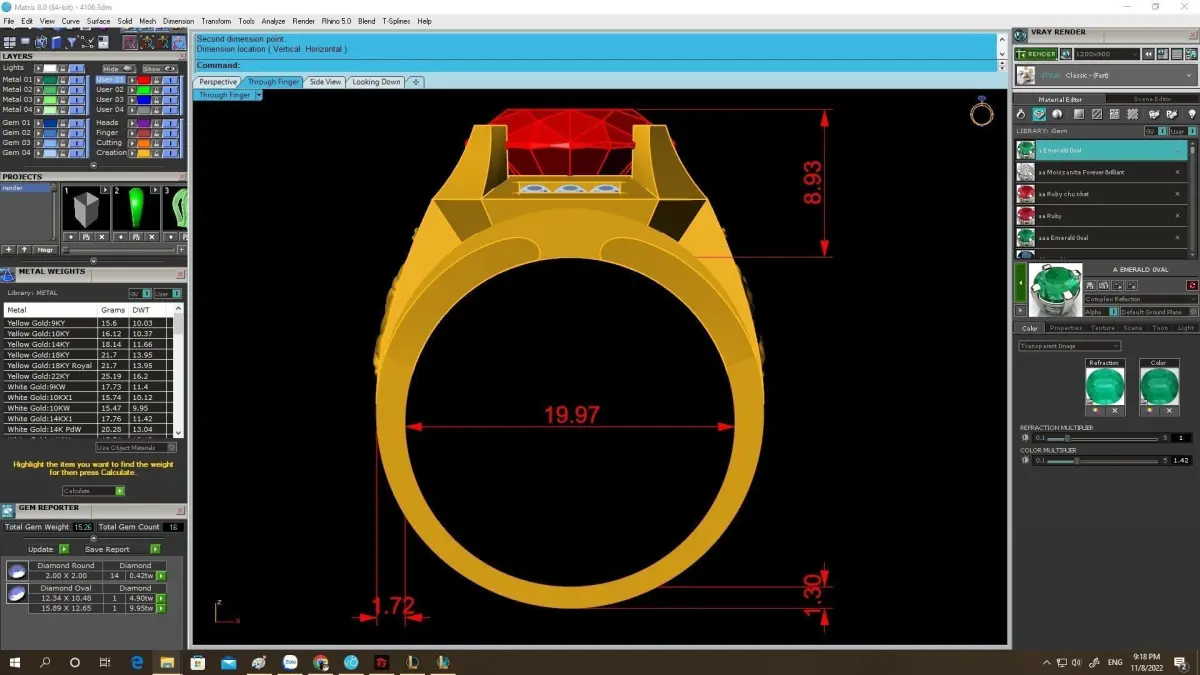 All essential technical specifications, including exact dimensions, gemstone size, stone counts, and estimated metal weight, are clearly displayed in the preview images. This allows jewelers and manufacturers to accurately evaluate the model before casting.