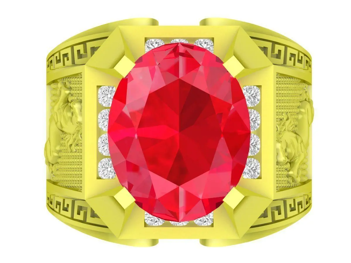 This luxury oval ruby signet ring is a professional 3D jewelry model designed for high-end men’s jewelry manufacturing. The ring features a large oval-cut center gemstone set within a bold signet structure, enhanced by clean geometric details and decorative side engravings that create a strong and masculine appearance.