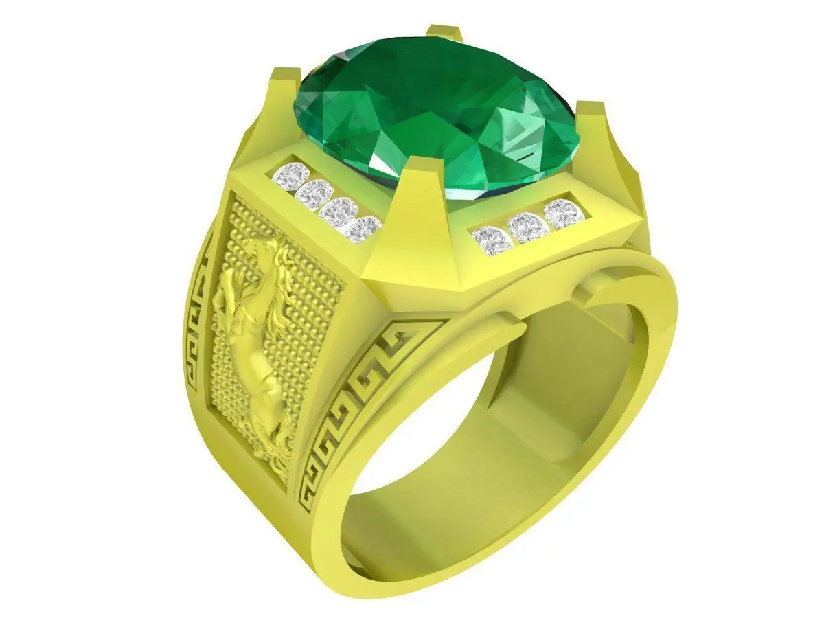The design balances visual impact with structural stability, featuring a solid shank and reinforced gemstone setting suitable for real-world production. The geometric motifs on the sides add architectural character and timeless elegance, making the ring ideal for statement jewelry, signet rings, and premium men’s collections.