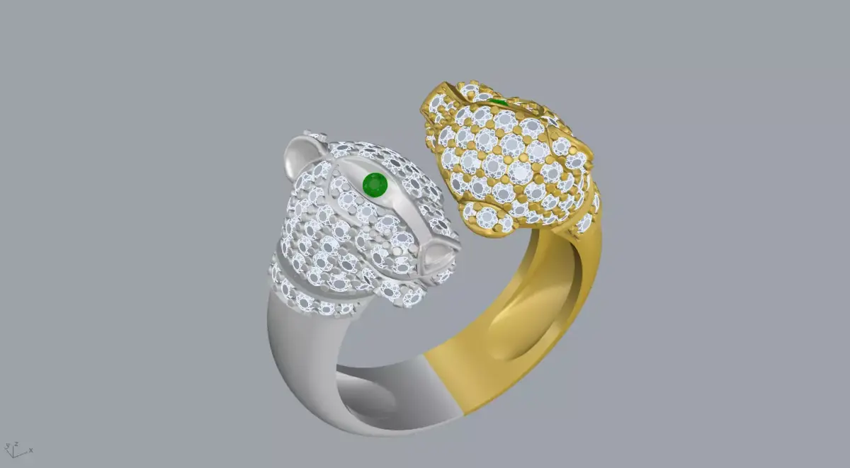 This is a high-quality 3D model of a luxury panther head ring designed in a dual-tone style of white gold and yellow gold. The ring is richly encrusted with diamonds and features vivid green emerald eyes, giving it a bold and elegant appearance.The model is optimized for jewelry design, 3D printing, rendering, and presentation. Perfect for use in jewelry collections, visualization projects, or as a base for real production.