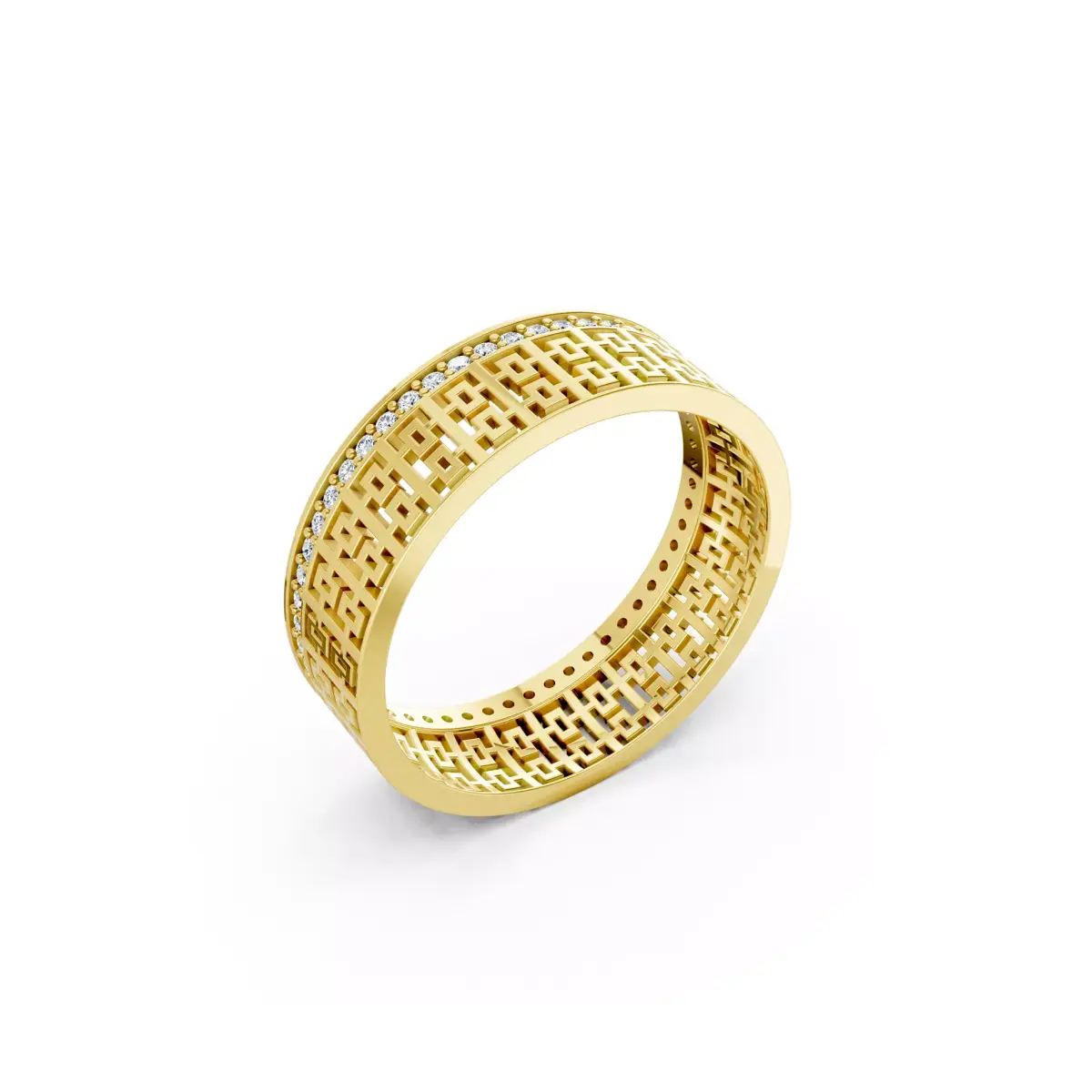 This premium luxury band ring CAD design features a highly detailed geometric cut pattern with elegant stone setting on the edges, giving it a modern yet royal look. The design is perfectly balanced for both men and women, making it ideal for couple rings, wedding bands, and high-end fashion jewellery.