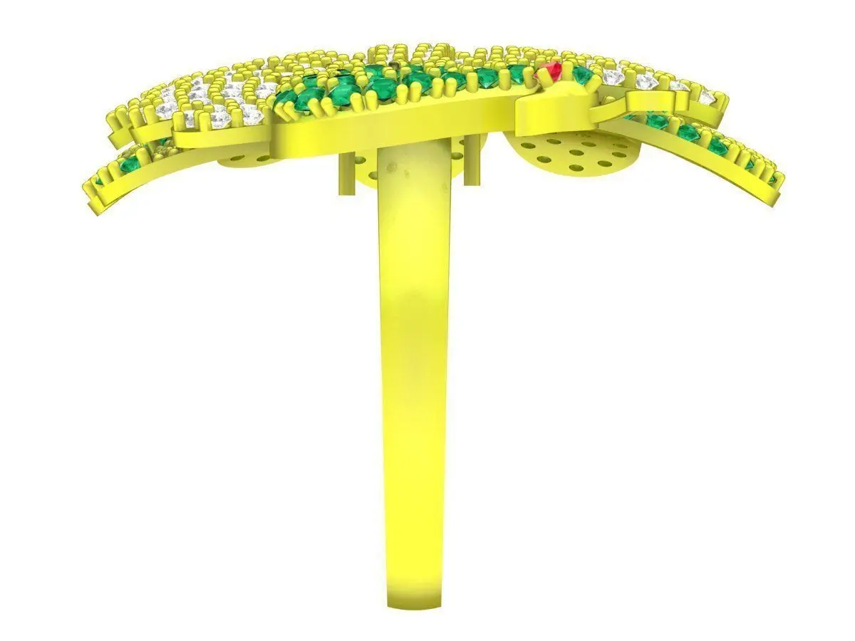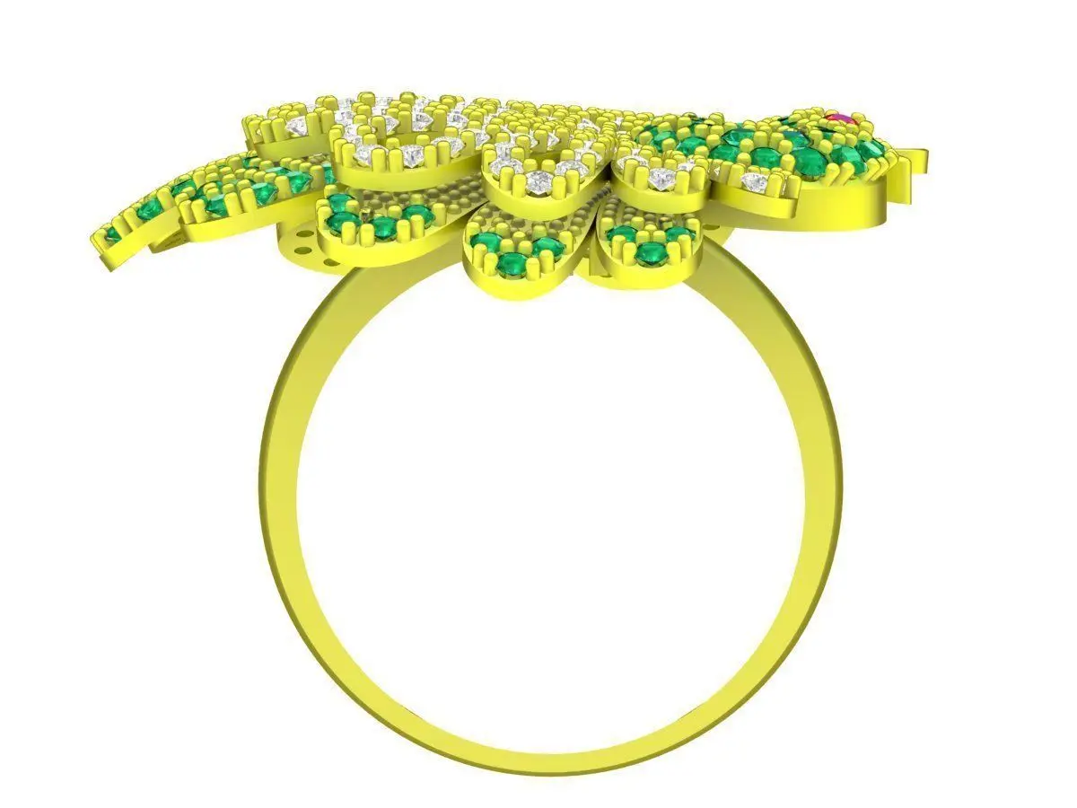 This luxury peacock ring 3D jewelry model features an elaborate and artistic design inspired by the elegant beauty of a peacock. The ring showcases a wide, fan-shaped peacock motif, richly decorated with multiple gemstone settings that create a vivid and luxurious appearance.