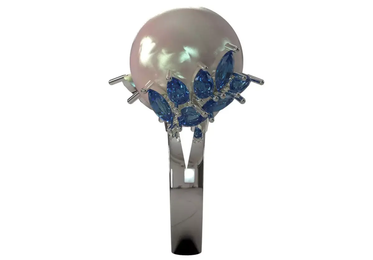 | Specification | Technical Description || :--- | :--- || Model and Design Code | Jewelry Ring, Code PR0077. || Application | 3D file (STL/3DM) for jewelry production (printing and casting). || Metal | White metal with a polished and shiny finish (suitable for making with white gold, platinum or silver). || Main stone | Large pearl. The pearl cut is spherical or semi-spherical and has a bright pearly luster (possibly a soft pink). || Side stones | Marquise (boat/almond cut) stones with a garlic blue color (similar to sapphire). || Setting design | Blue marquise stones in a cluster and petal-like shape surround the central pearl. || Base design | The ring base has a modern and sturdy design to support the weight of the large pearl and side stones. |