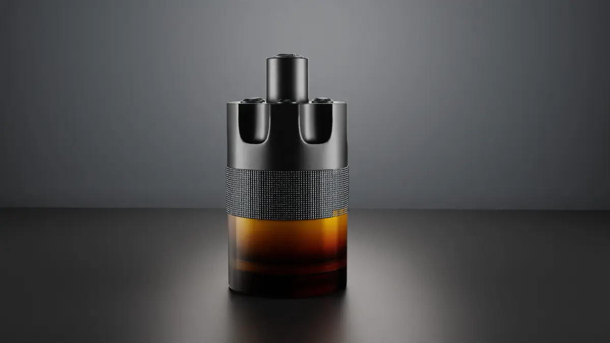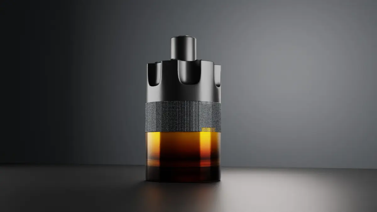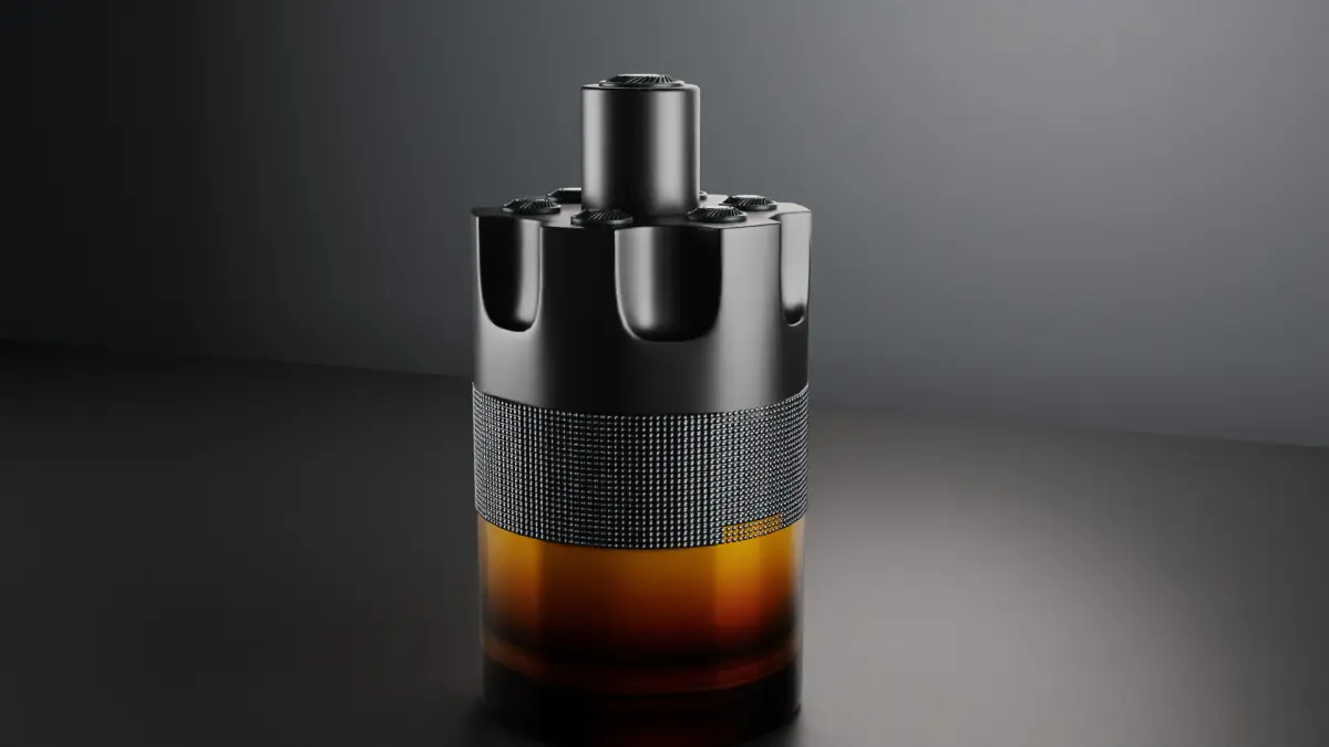 This high-quality 3D model represents a luxury perfume bottle designed with a bold, masculine aesthetic. The upper part features a sleek matte black cylindrical top with a metallic grid texture, while the lower part showcases a warm amber glass body. Ideal for product visualization, advertising, or high-end cosmetic branding projects.