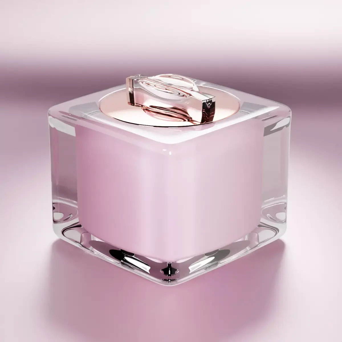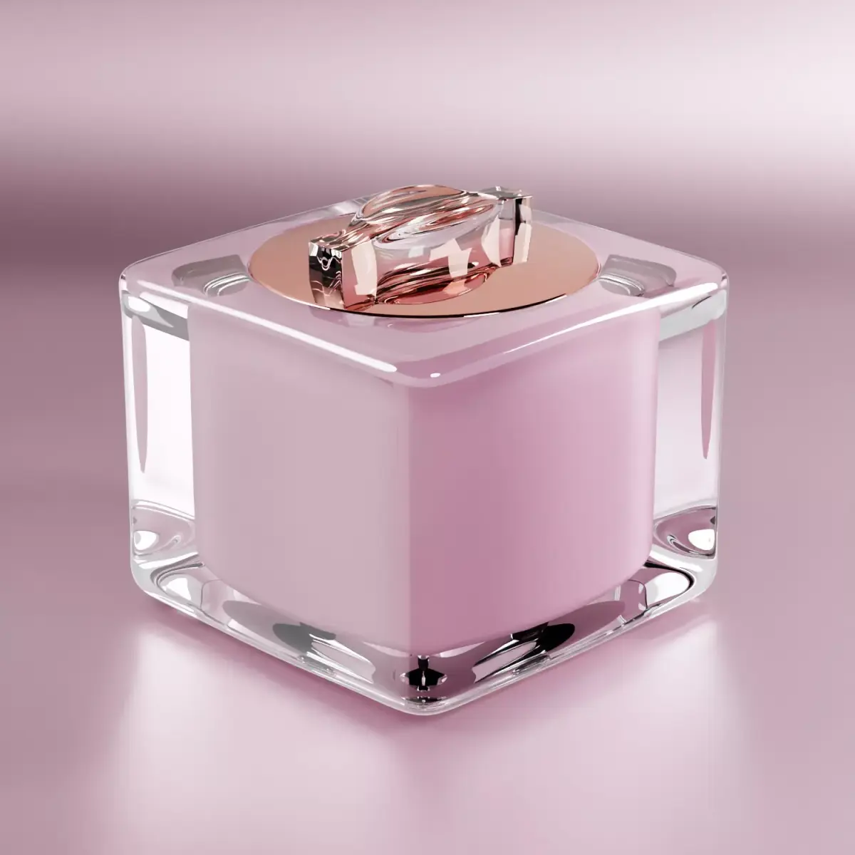 This model features a modern square glass outer body with a rose-gold metallic lid and a soft pastel pink inner jar — designed to showcase elegance and sophistication.