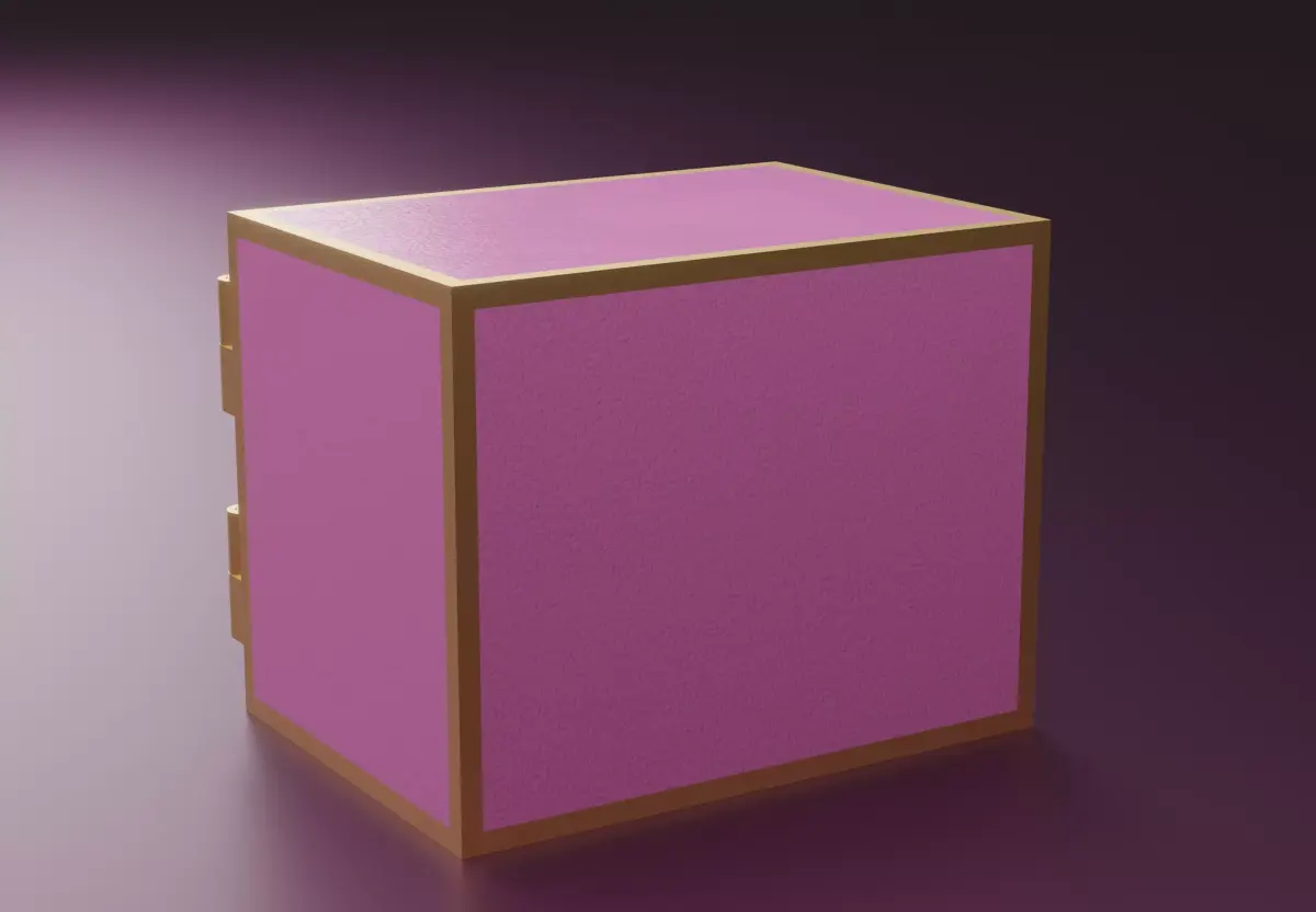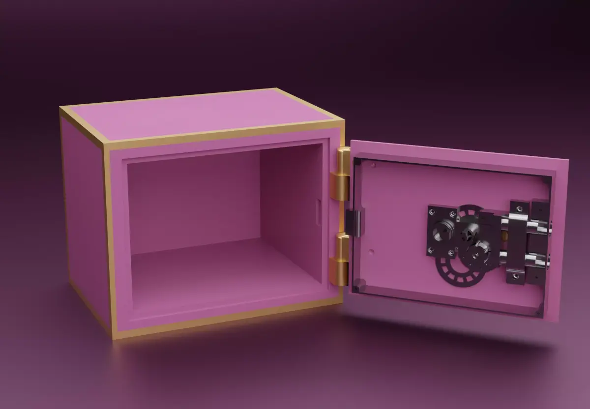 A high-fidelity 3D model of a luxury safe vault, featuring a vibrant pink textured finish with gold-plated accents. This model includes a detailed mechanical locking system on the interior of the door, making it ideal for high-end interior renders, heist-themed animations, or luxury product displays
