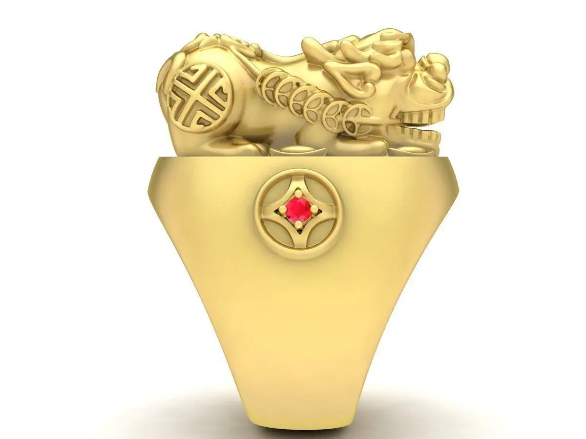 This luxury Pixiu ring jewelry design features a finely sculpted Pixiu creature, a traditional symbol of wealth attraction, protection, and prosperity in feng shui culture. The design combines a powerful Pixiu motif with gemstone accents on the ring sides, creating a bold and meaningful statement piece for high-end men’s jewelry collections.