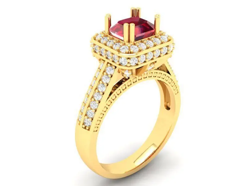 This elegant 3D model features a luxurious engagement ring with a stunning princess-cut center gemstone, surrounded by two rows of brilliant round diamonds. The detailed pavé setting enhances the brilliance of the central stone, making the design perfect for modern fine jewelry collections. The ring’s sophisticated symmetry and layered structure make it suitable for high-end customization.