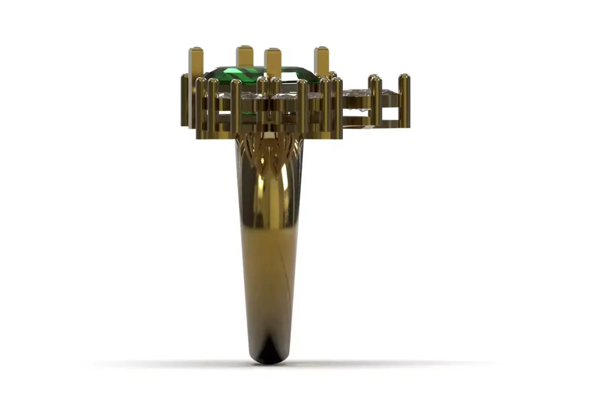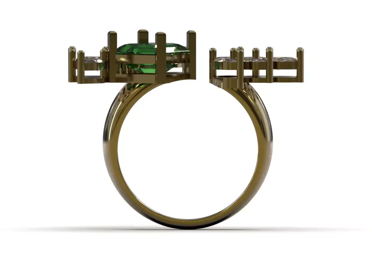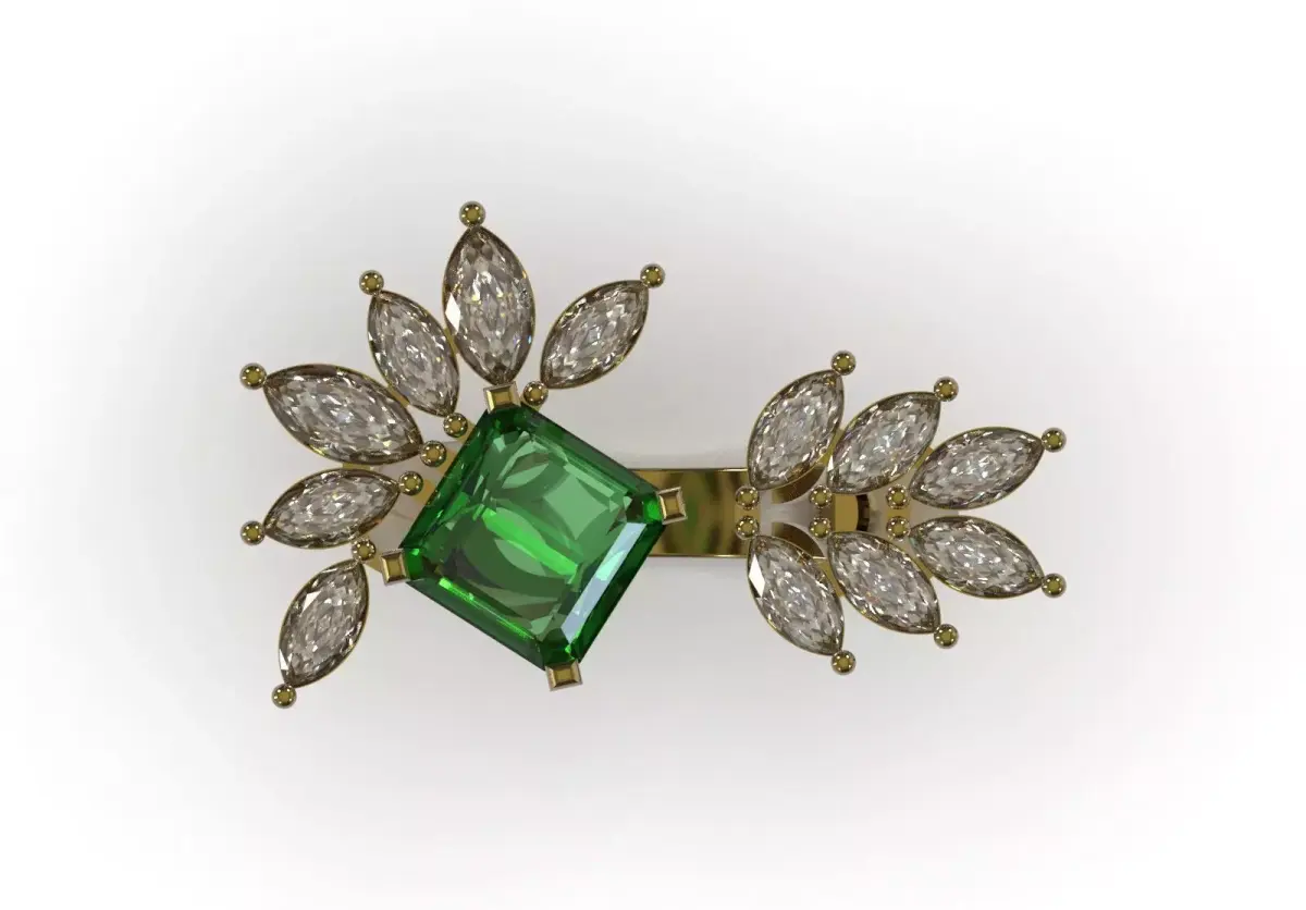 - Gem suggestion: Suggest that emerald or green tourmaline can be used for the center gem and diamond (brilliant) for the marquise gems.