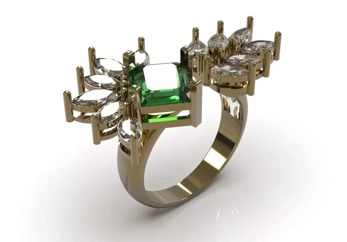 - Side Stones: Two symmetrical rows of Marquise cut stones arranged in a cluster, evoking a wing or petal design.