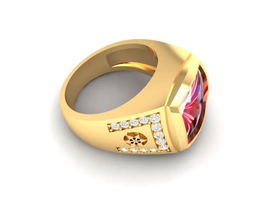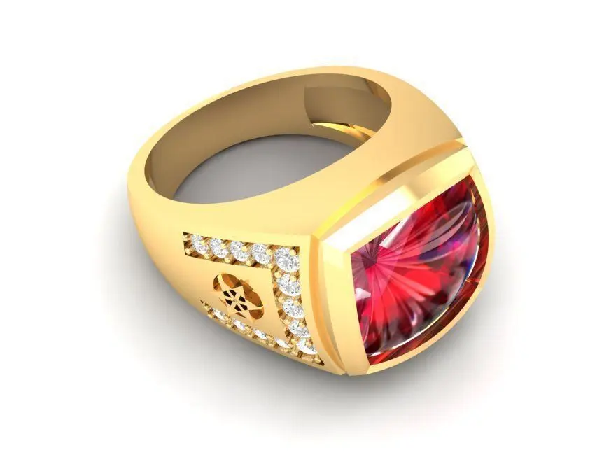 This Luxury Red Gemstone Men Ring 3D model features a bold yet refined design with a cushion-cut red gemstone as the centerpiece, enhanced by sparkling side diamonds. The ring’s smooth curves and strong geometric lines create a look that is both modern and timeless, symbolizing power, confidence, and success.