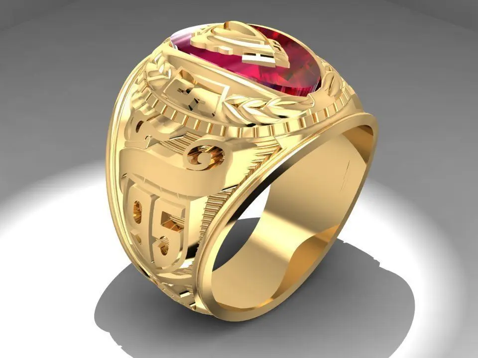 This 3D model showcases a luxury red oval gemstone gold ring for men, featuring an intricate engraved design that represents power and refinement.