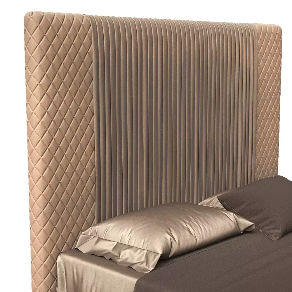 Objects: headboard center ribbed panel, left/right quilted wings, bed base, mattress, fitted sheet, duvet/bedspread, 2 pillows + throw cushion