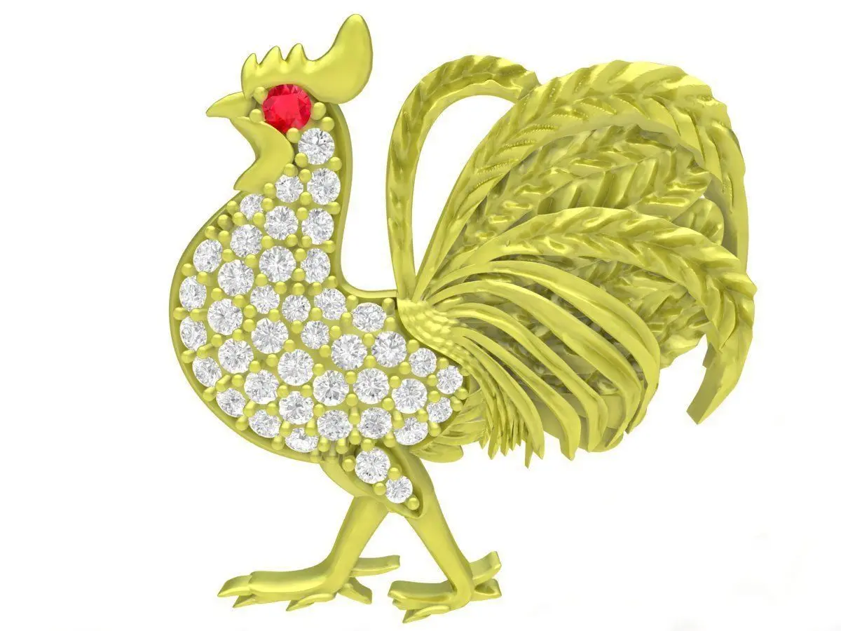 This luxury rooster pendant showcases a highly detailed and artistic design inspired by the powerful and symbolic rooster motif. The body is decorated with pavé-set gemstones, while the tail feathers are sculpted with layered flowing details, creating strong depth and dynamic movement.