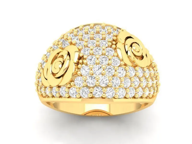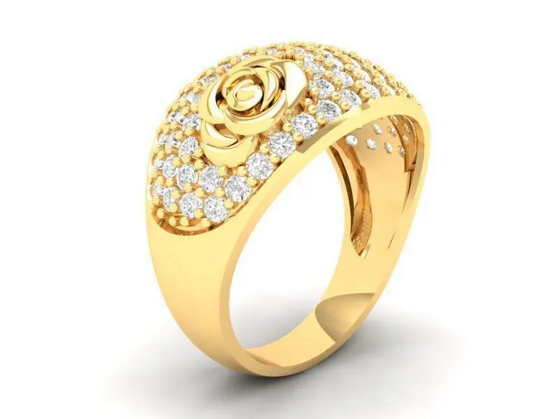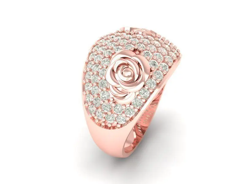 This luxury womens ring features a romantic rose flower design beautifully surrounded by a pave diamond surface. The combination of smooth curves and shimmering stones makes it a standout piece of fine jewelry. The elegant dome shape highlights the delicate floral motif while adding volume and brilliance to the overall look. It is ideal for special occasions, evening wear, or as a signature fashion ring.