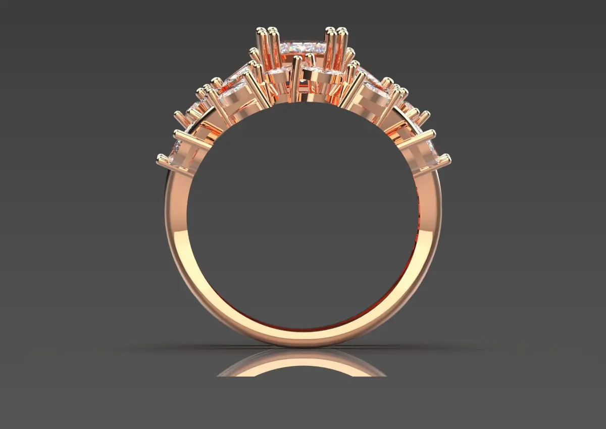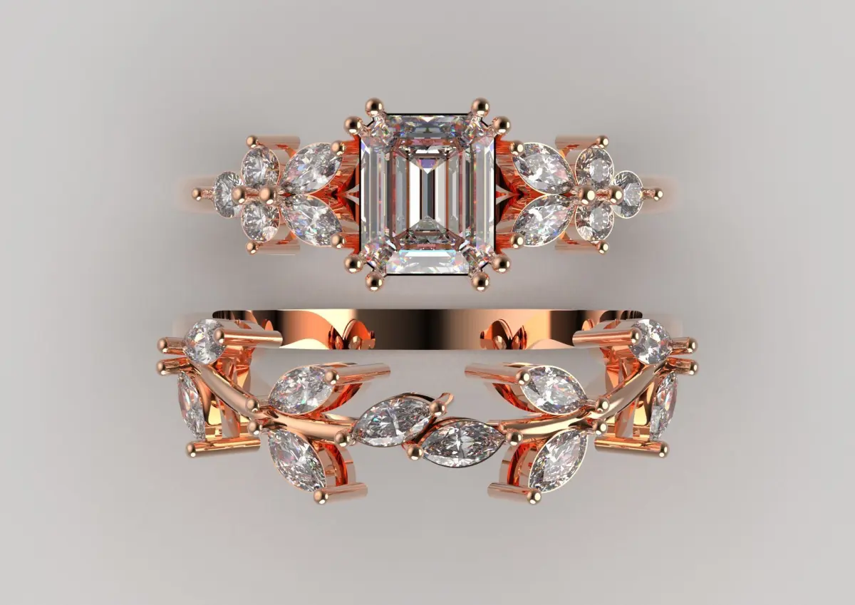 The first ring has a rectangular center diamond that sits at the top of the ring and is surrounded by a row of other sparkling stones. The arm of the ring is designed in a natural shape, resembling tree branches, with small marquise-cut diamonds arranged as if they are growing from those branches. This design not only gives the ring a romantic and beautiful look, but also has a special brilliance and splendor.