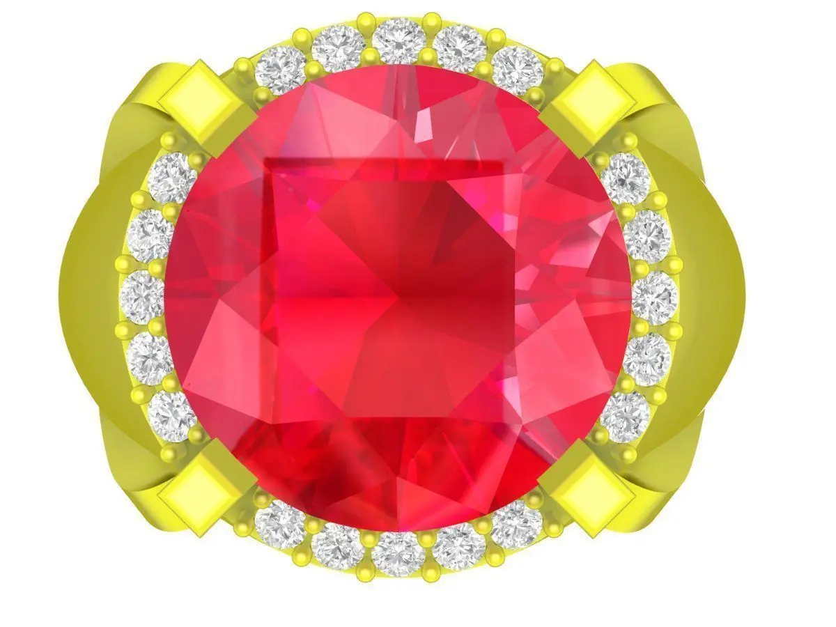 This luxury ring design features a striking round cut ruby as the center stone, carefully set in a classic prong setting to maximize brilliance and light return. Surrounding the main ruby is a refined halo of small round stones, enhancing depth, contrast, and overall visual impact. The shank is sculpted with smooth, flowing lines, providing both elegance and structural strength suitable for fine jewelry production.