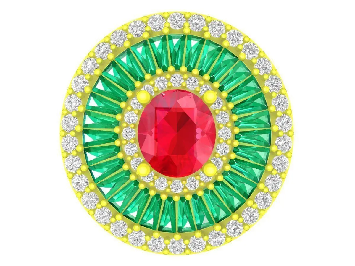 This 3D jewelry model showcases a luxury round cocktail ring featuring a multi-layer halo structure with a bold central round stone. The design combines a classic round centerpiece with concentric pavé halos and baguette-cut accents, creating strong brilliance and visual depth.
