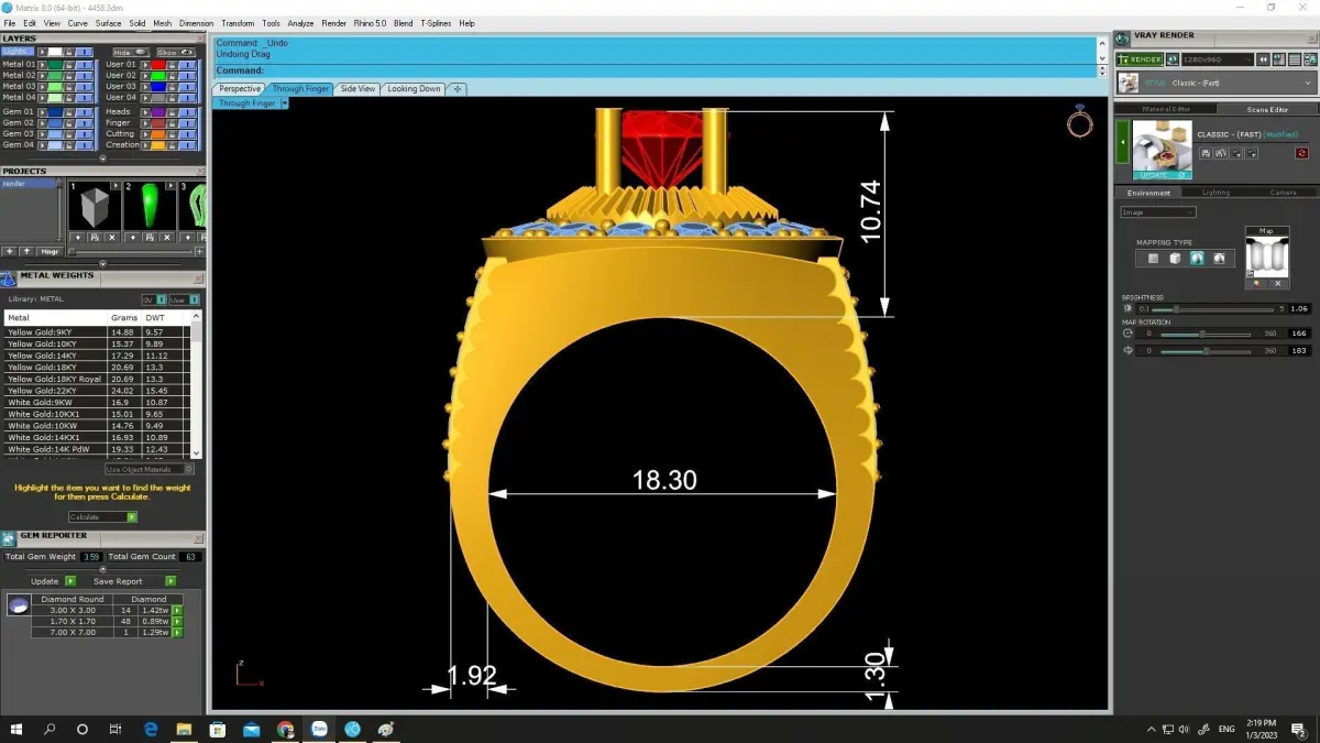 All preview images include complete technical details such as dimensions, thickness, stone sizes, stone count, and metal weight. The model is optimized for jewelry casting, stone setting, and polishing in gold or silver production.