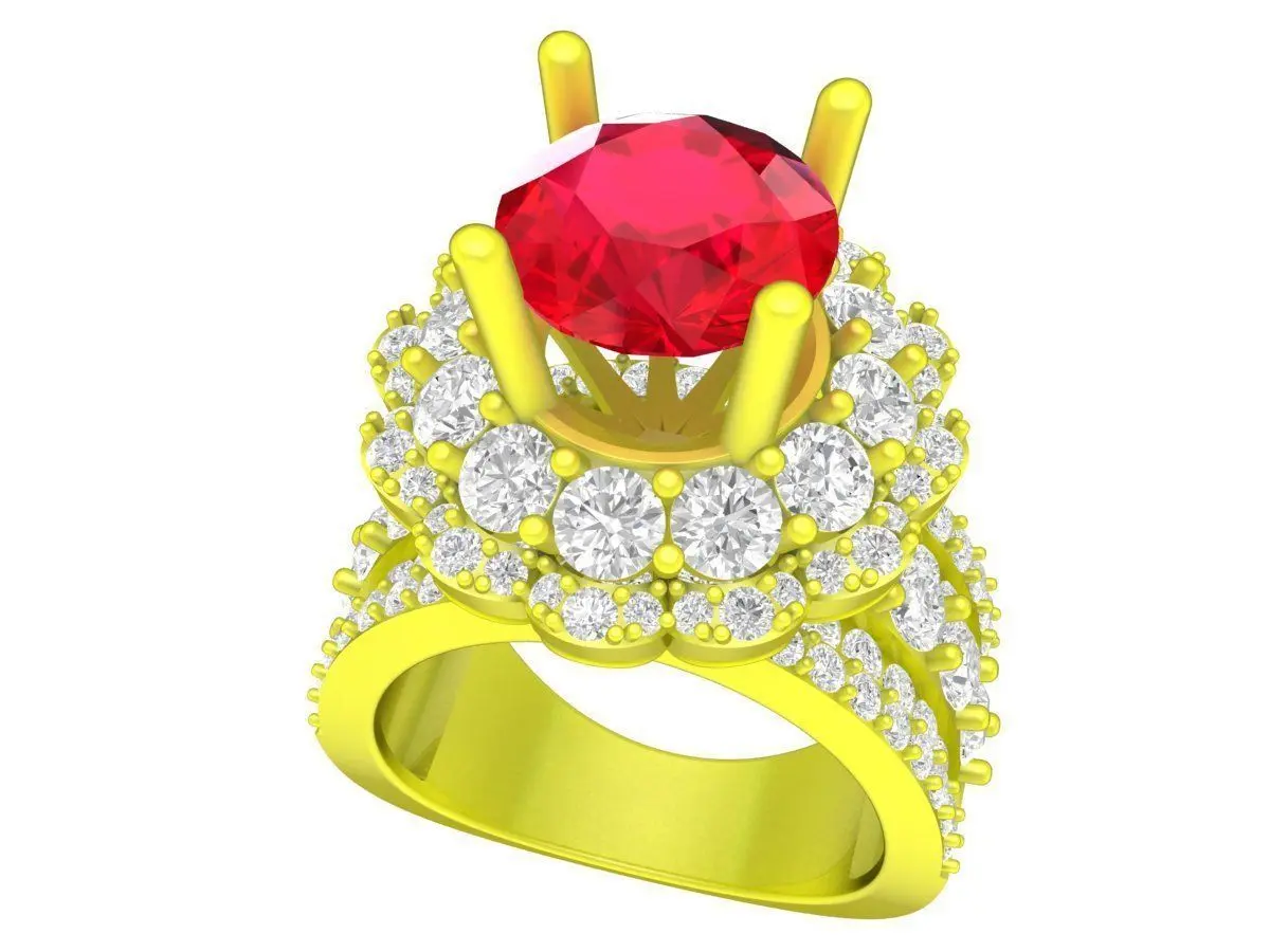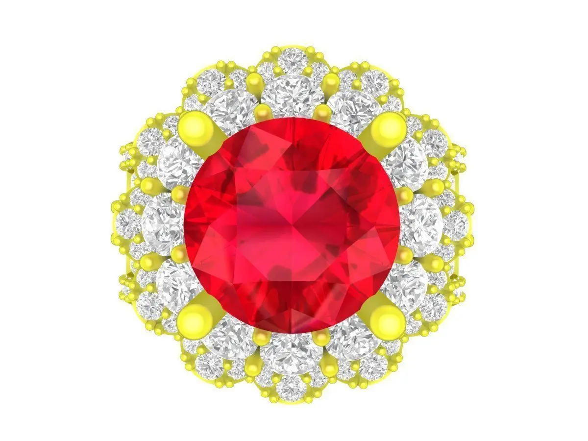 This luxury round halo gemstone ring is a high quality 3D jewelry model created for professional fine jewelry design and production. The ring features a large round center stone elevated above a double halo of smaller stones, combined with a pavé diamond band that enhances brilliance and visual depth.