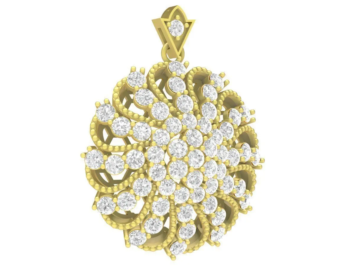 This is a high-quality 3D jewelry model of a luxury round pavé diamond pendant designed with a refined floral and cluster-inspired structure.