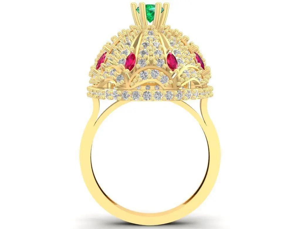 This Luxury Royal Crown Gemstone Ring 3D model features a majestic crown-inspired design with an intricate arrangement of gemstones including emerald, ruby, and diamond. The dome-shaped setting and high-polished metal structure create a luxurious and elegant impression suitable for statement jewelry collections.