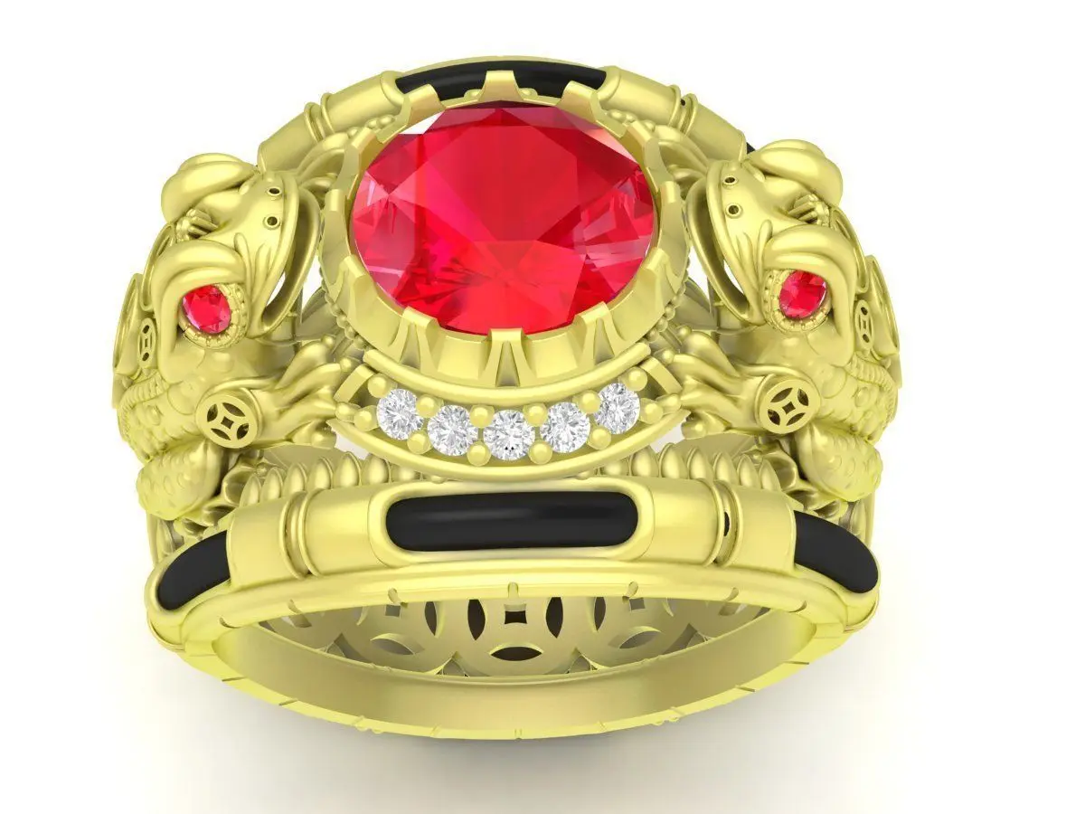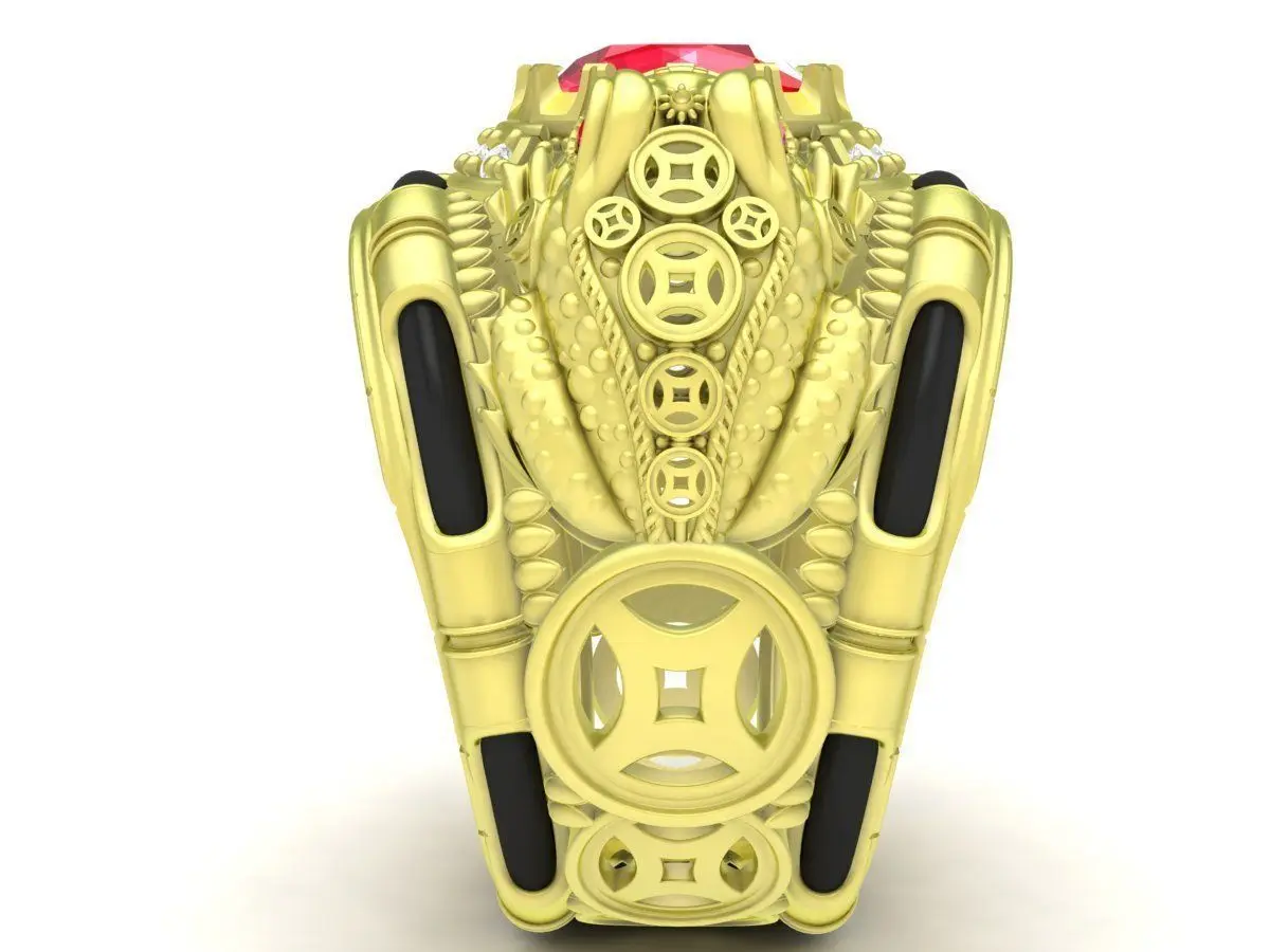 This high-end 3D jewelry model showcases a luxury men’s ring featuring a bold royal design centered around a large red gemstone. The ring structure combines strong architectural lines with intricate ornamental details, creating a powerful and prestigious appearance suitable for statement jewelry.