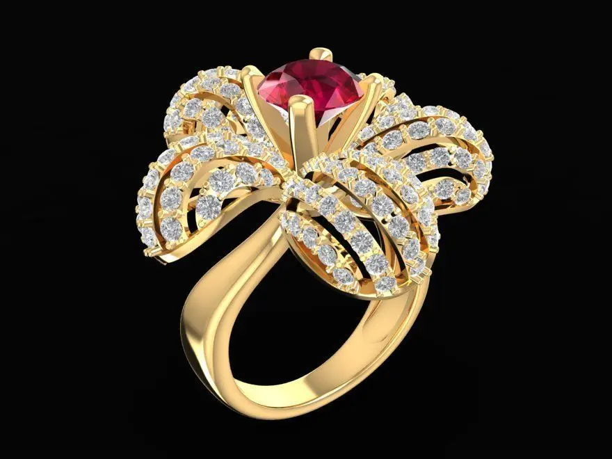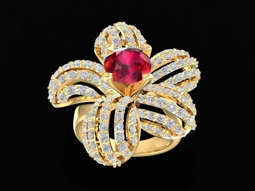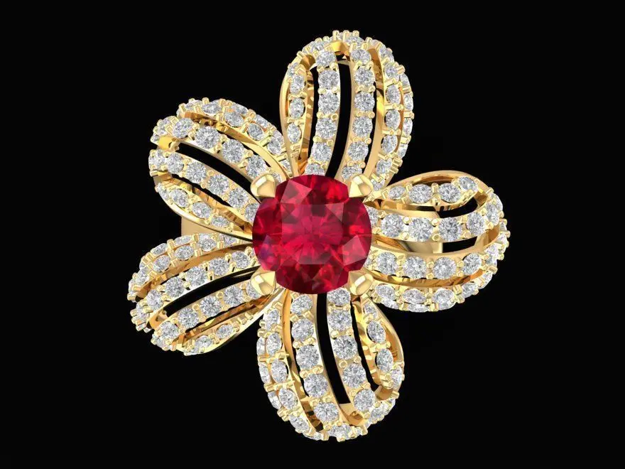 This luxury ruby flower diamond ring for women 3D model features an elegant five-petal floral design symbolizing beauty, love, and prosperity.