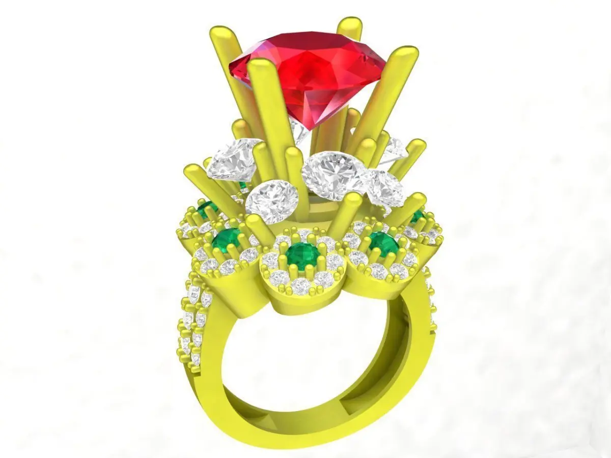 This luxury ruby halo crown ring 3D model showcases a bold and elegant design featuring a large round-cut ruby as the center stone. The ruby is elevated in a crown-style prong setting, allowing maximum light exposure and enhancing brilliance from multiple angles.