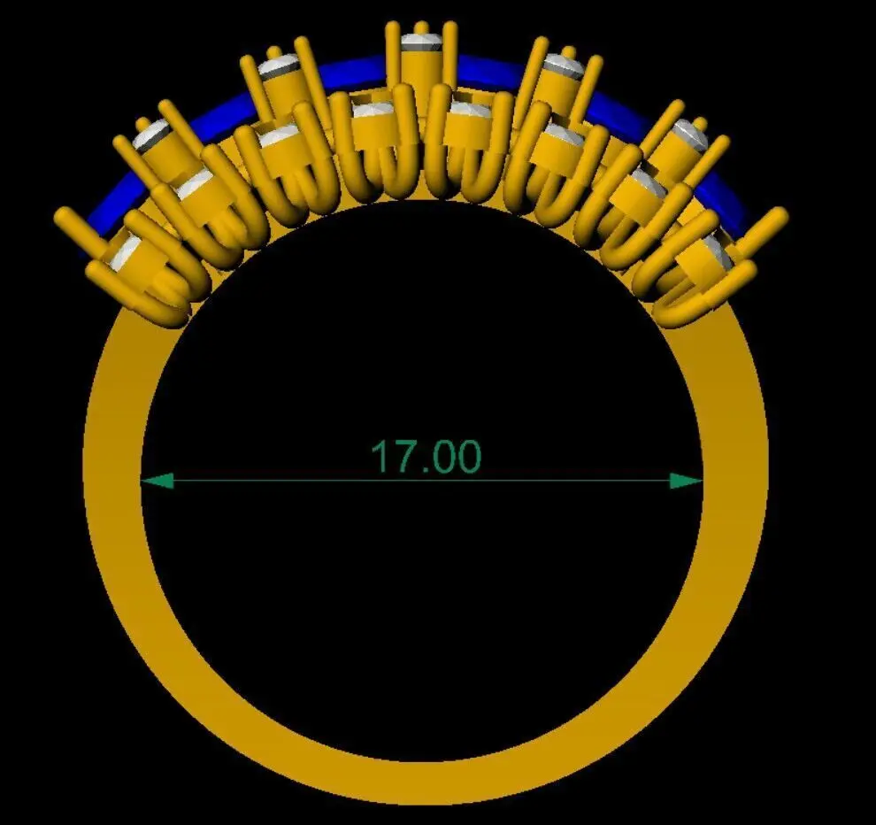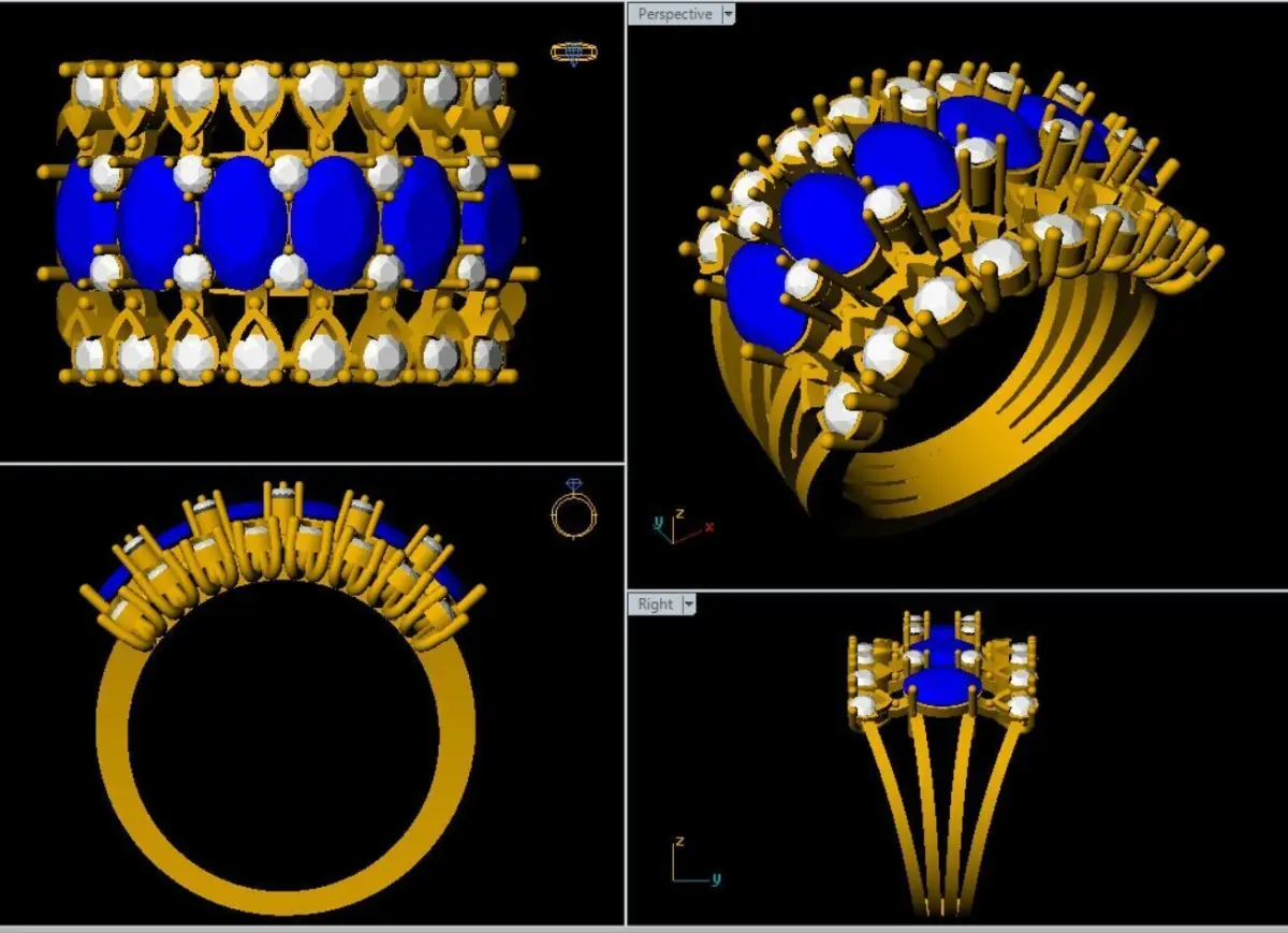 This exquisite 3D CAD model showcases a high-end cocktail ring, masterfully designed with bold elegance and intricate gemstone settings. The centerpiece of the design features a row of rich, oval-cut blue sapphires, flanked by sparkling round and pear-shaped diamonds, all set in a luxurious yellow gold band. A true showstopper for formal and statement jewelry collections.