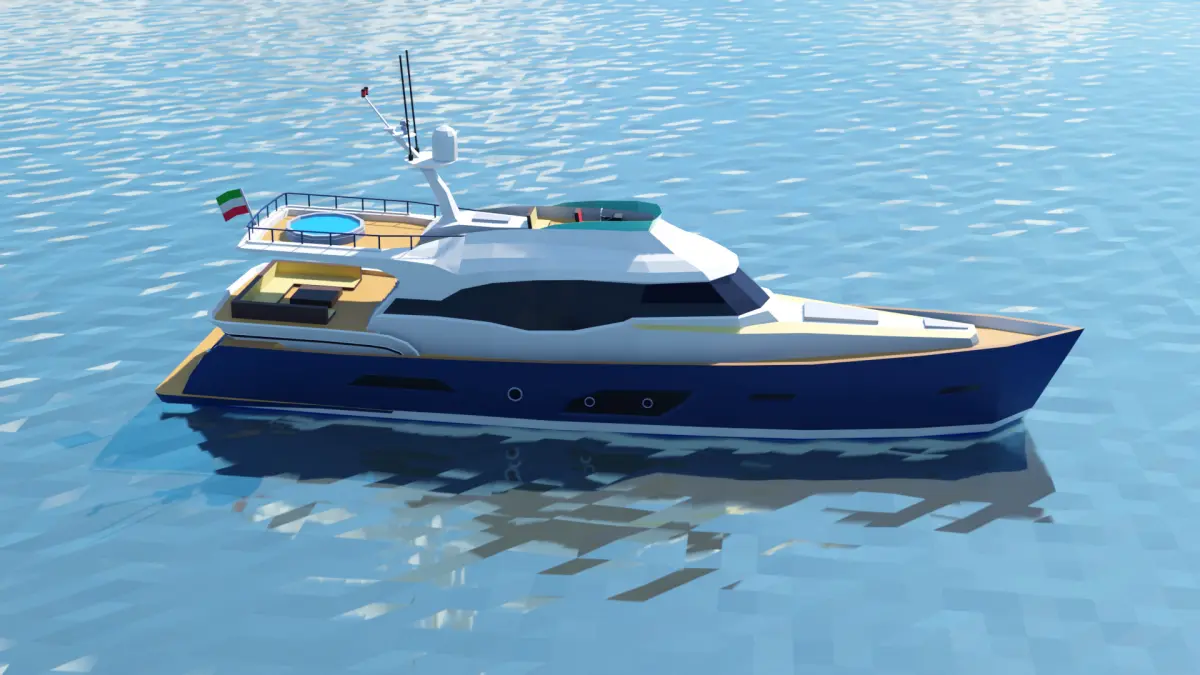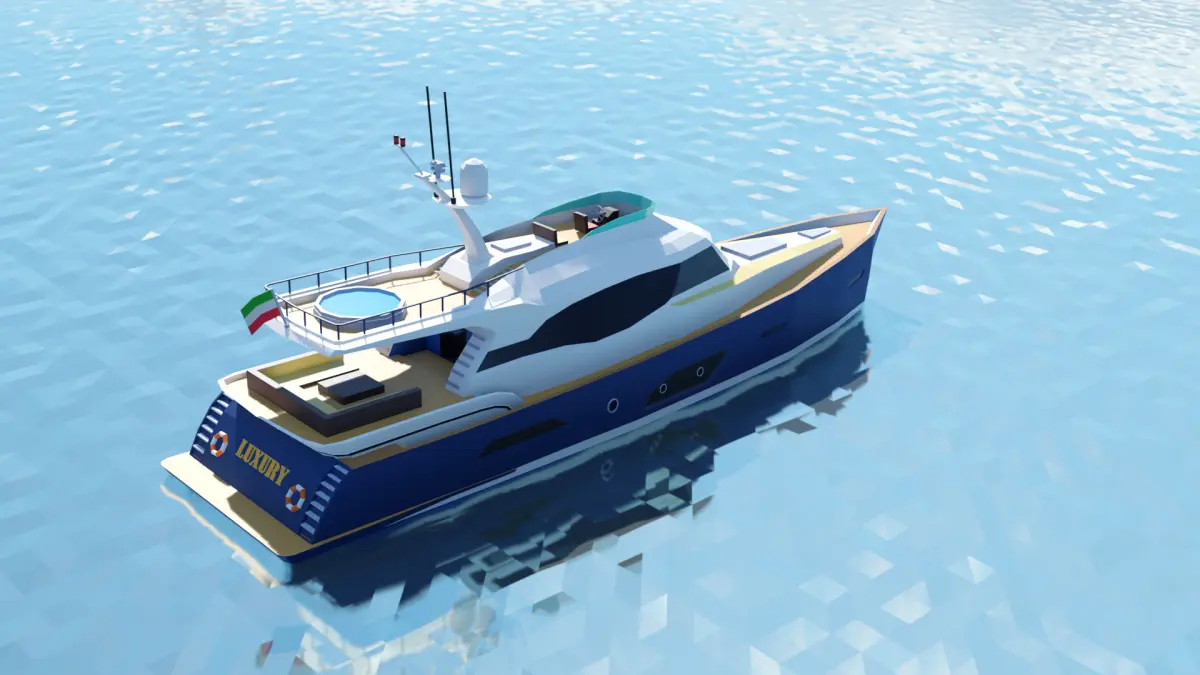 Luxury yacht low poly model with multiple levels and a sophisticated design, featuring simple-colored materials and no textures. Ideal for maritime exploration games. Its modern aesthetic makes it perfect for premium ocean environments. The clean and texture-free design allows for easy integration into various visual styles.