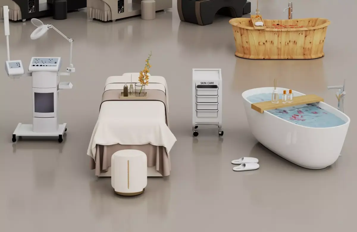 High-quality 3D model collection of luxury spa and beauty salon equipment, including massage beds, pedicure units, treatment machines, bathtubs, seating, and wellness furniture.