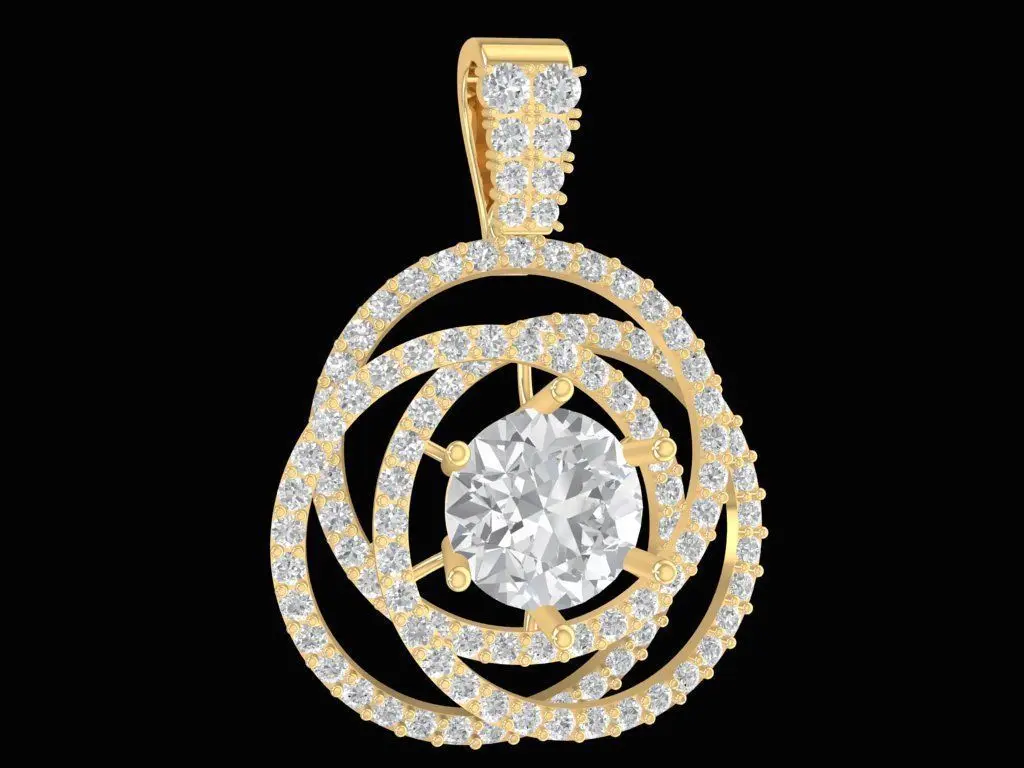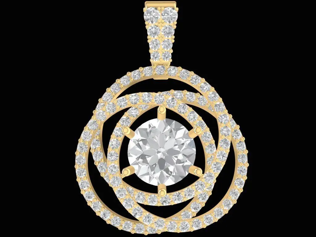 This 3D model showcases a luxury spiral halo gemstone pendant for women, featuring an elegant circular swirl design with a brilliant-cut center stone.