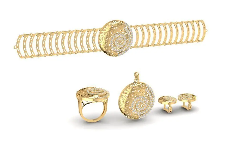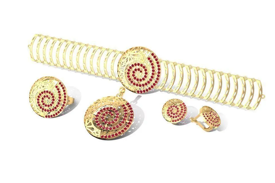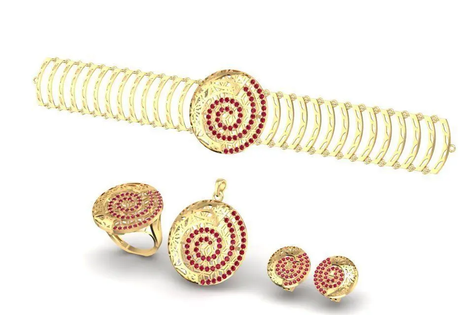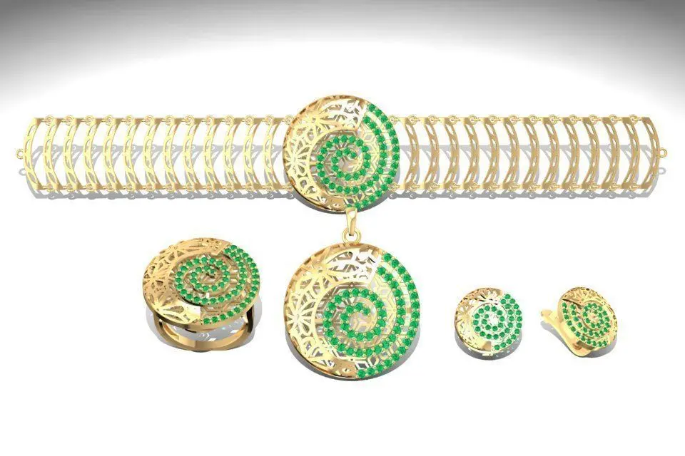 This 3D model showcases a complete luxury jewelry set, including a bracelet, ring, and earrings with a unique spiral design. The set features colorful gemstones in green and red, creating a vibrant and eye-catching appearance. Each piece is carefully detailed with accurate dimensions, stone settings, and weight information for multiple gold alloys. Suitable for 3D printing, rendering, or fine jewelry production, this jewelry set is ideal for designers and manufacturers looking to add an artistic and luxurious collection to their portfolio.