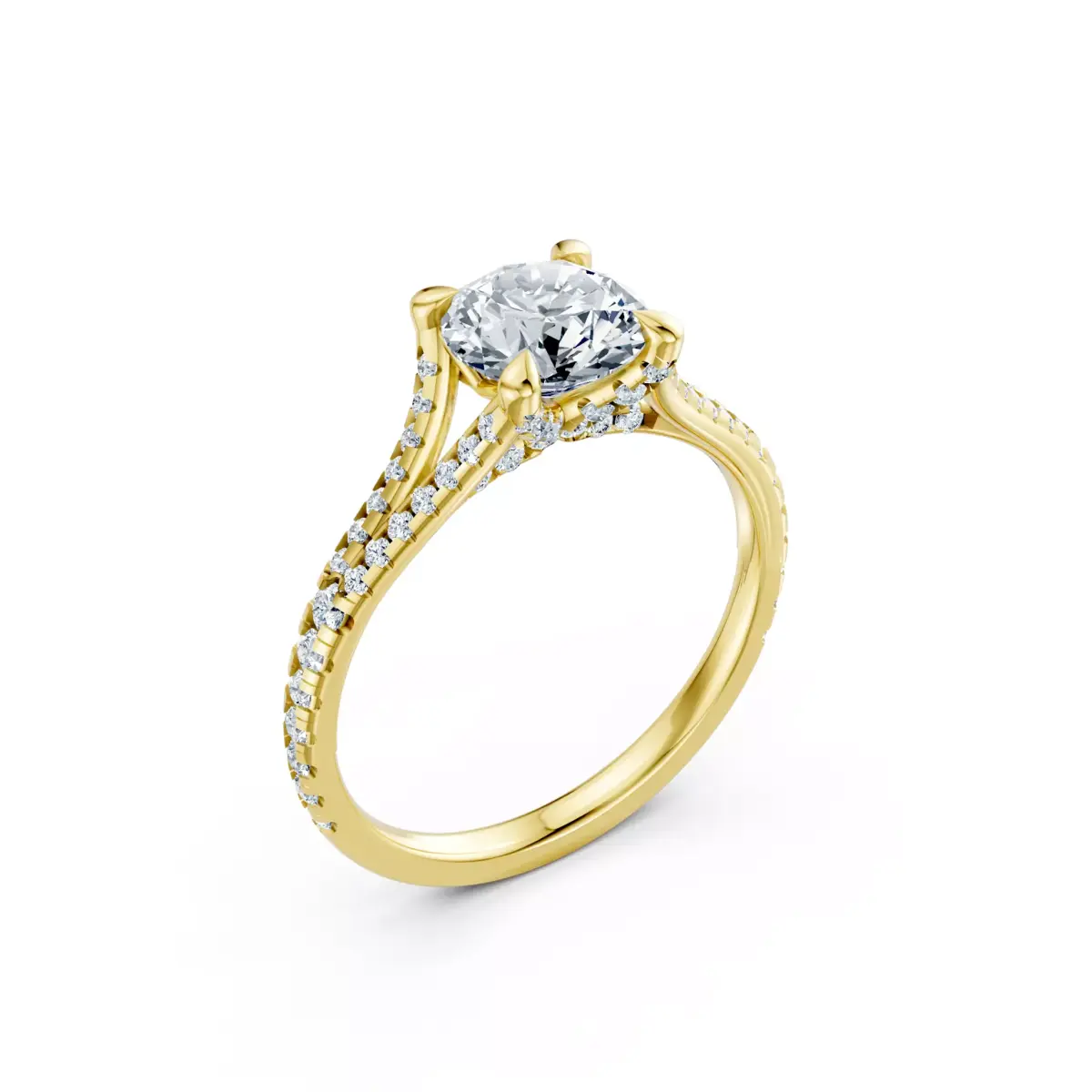 This luxury split shank pavé solitaire diamond ring CAD design features a brilliant round-cut center stone elevated in a strong prong setting, paired with a refined split shank accented by pavé diamonds. The split band adds depth and elegance while enhancing overall brilliance, giving the ring a premium and contemporary appearance.