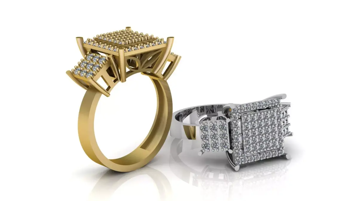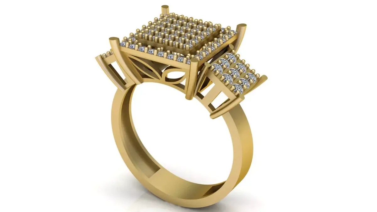 A stunning square-cluster gold diamond ring model designed for 3D printing and jewelry rendering. Perfectly crafted using Rhino3D and ZBrush for high precision and realistic stone setting details.