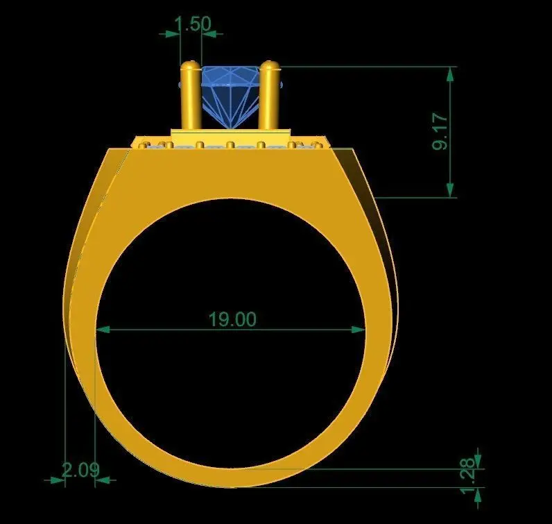 This luxury men’s ring features a bold square setting with a large central diamond surrounded by smaller accent stones. The strong geometric design reflects masculine power and refined taste, making it a perfect statement ring for formal or business wear. The model is designed for optimal balance, with polished surfaces and detailed prong settings for professional jewelry making.